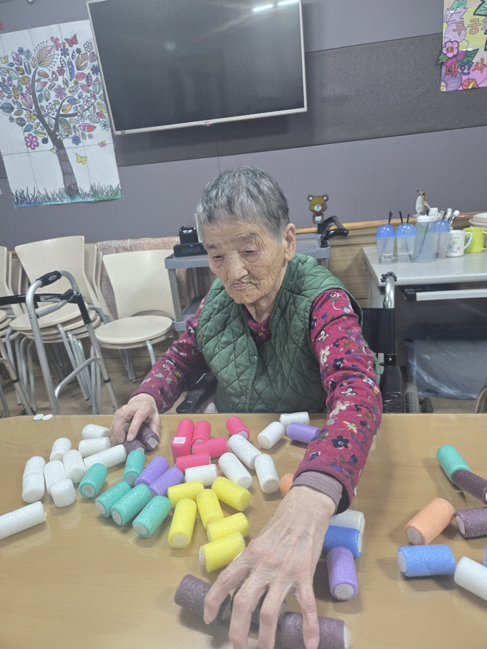 오늘 프로그램은 소근육을 사용함으로로 인지 기능을 향상시키는 콩고르기 프로그램입니다. 한곳에 섞여 있는 다양한 콩을 각각의 용기에 골라 담아보는 활동을 해 봅니다.
