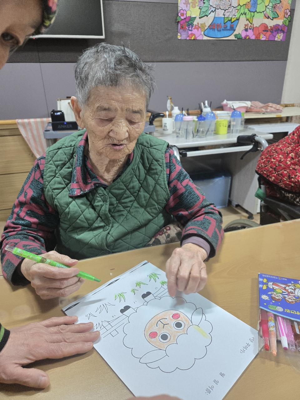 준비된 그림도안과 색연필을 어르신께서 만져보게 합니다.