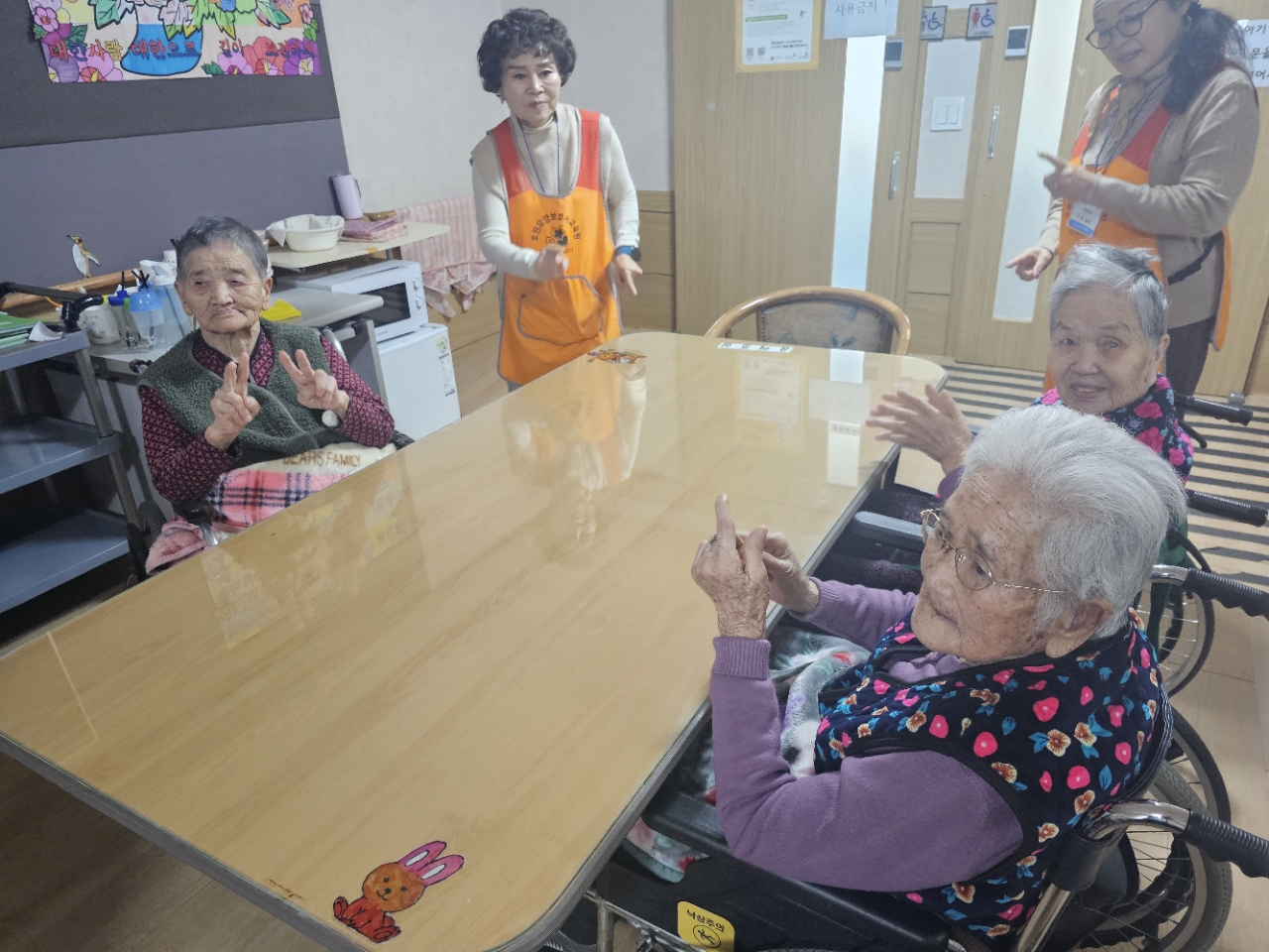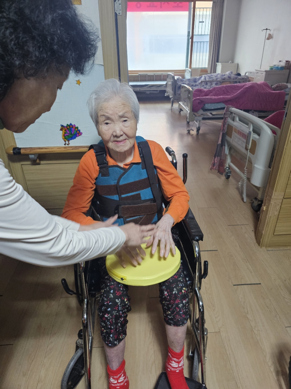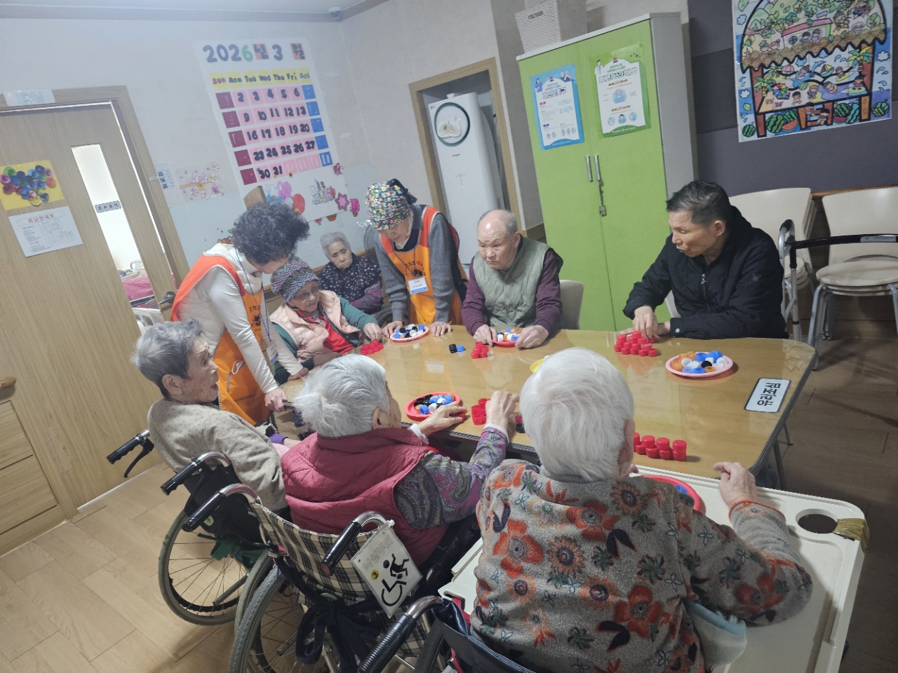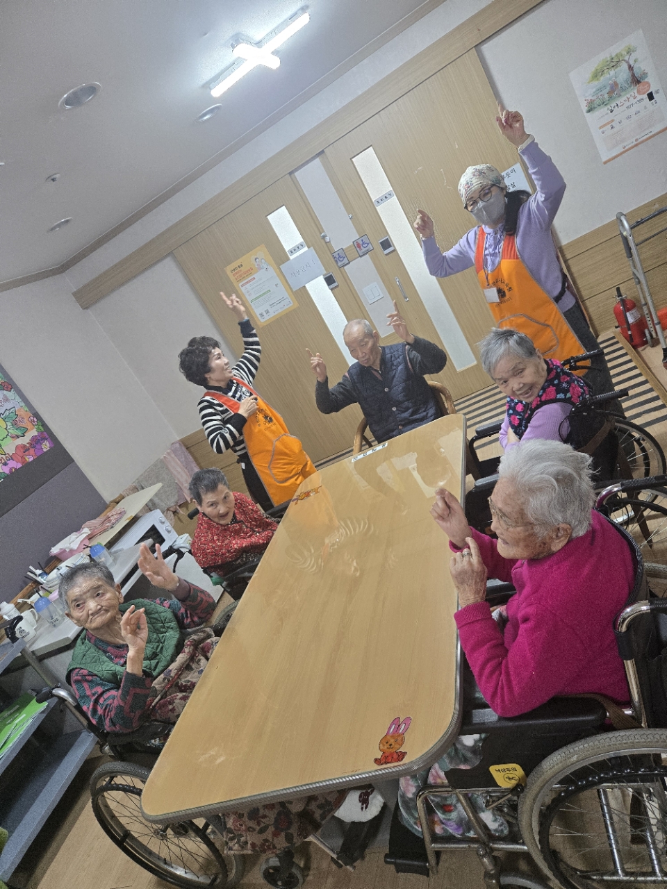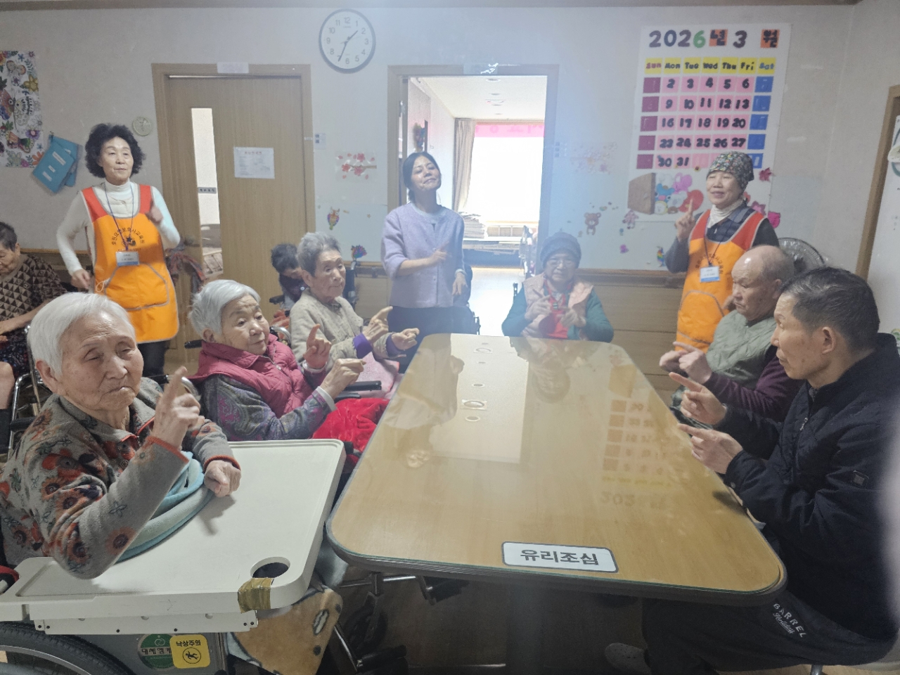 어르신들을 프로그램실로 모신 후 다 같이 인사를 하고 맨손체조를 하며 근육을 풀어줍니다.