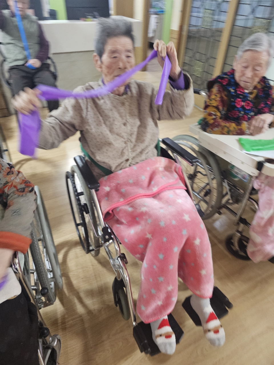 어르신들의 건강 증진과 근력 강화를 위해 탄력밴딩운동을 진행하였습니다.