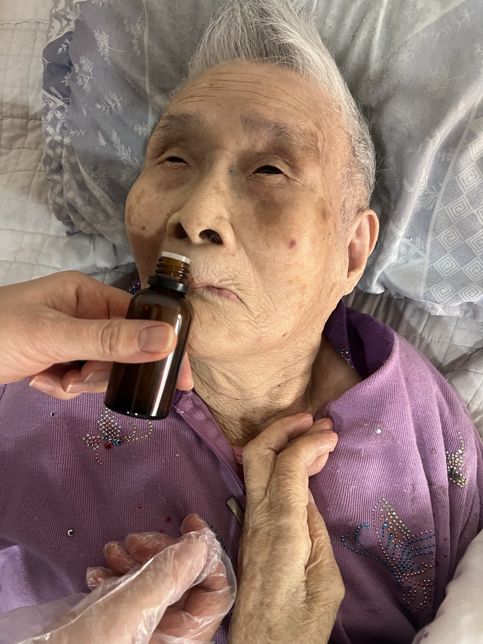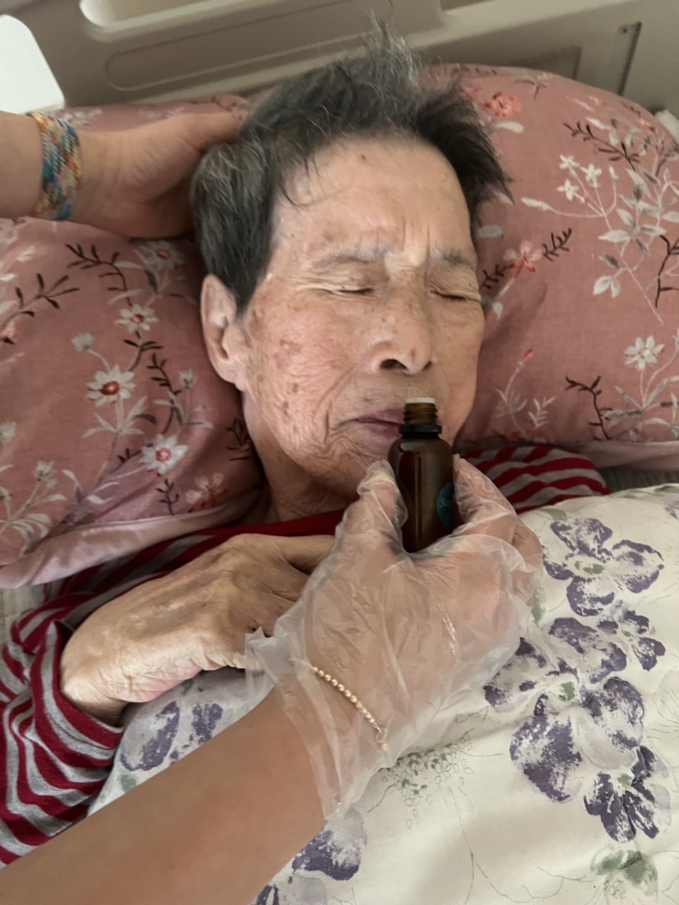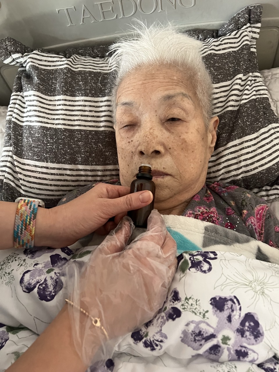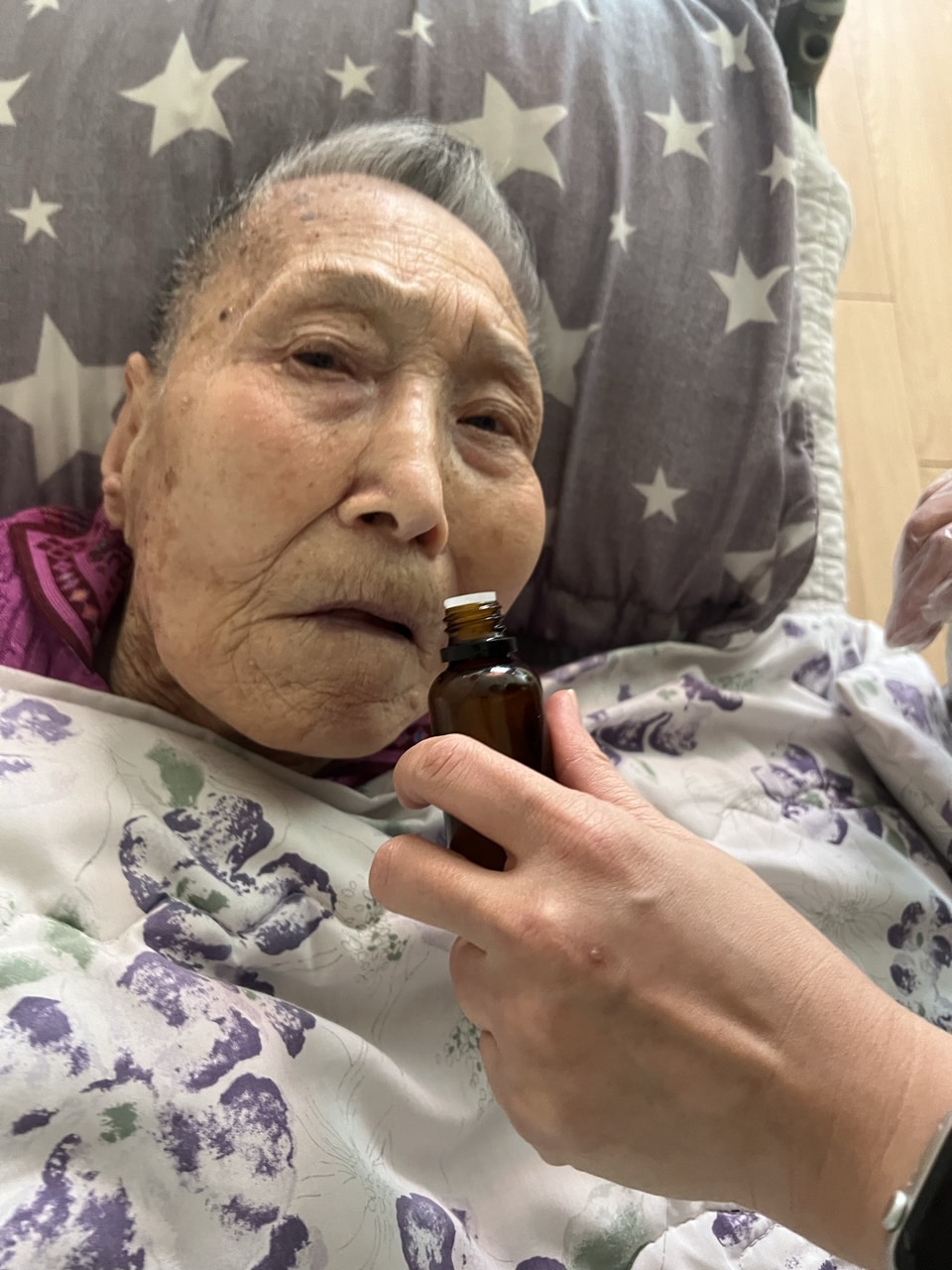 ② 진행 : 코에 오일 냄새를 맡게 하고, 관자놀이에 롤링기법으로 마사지를 해준다.