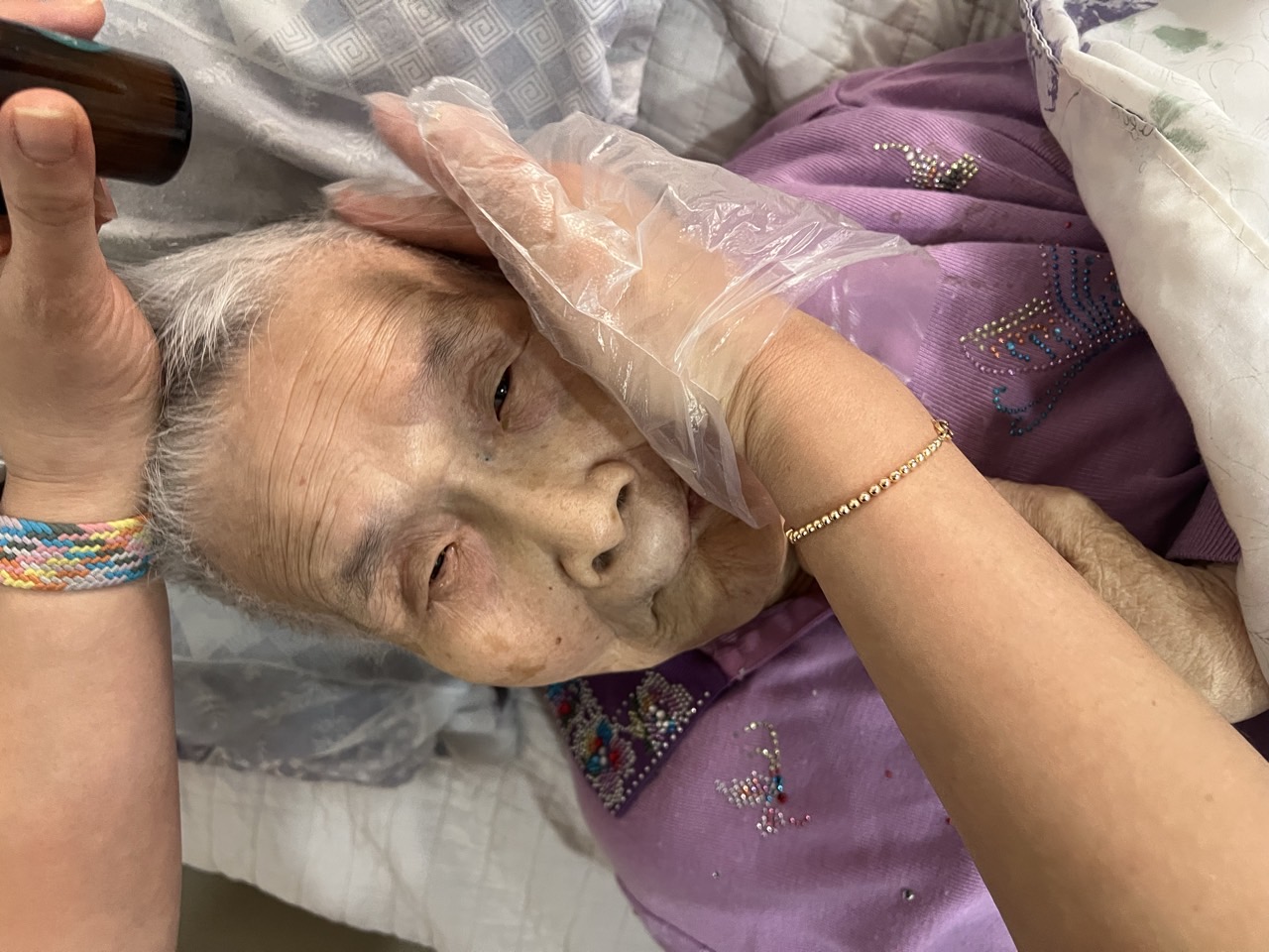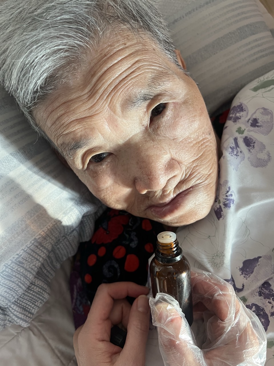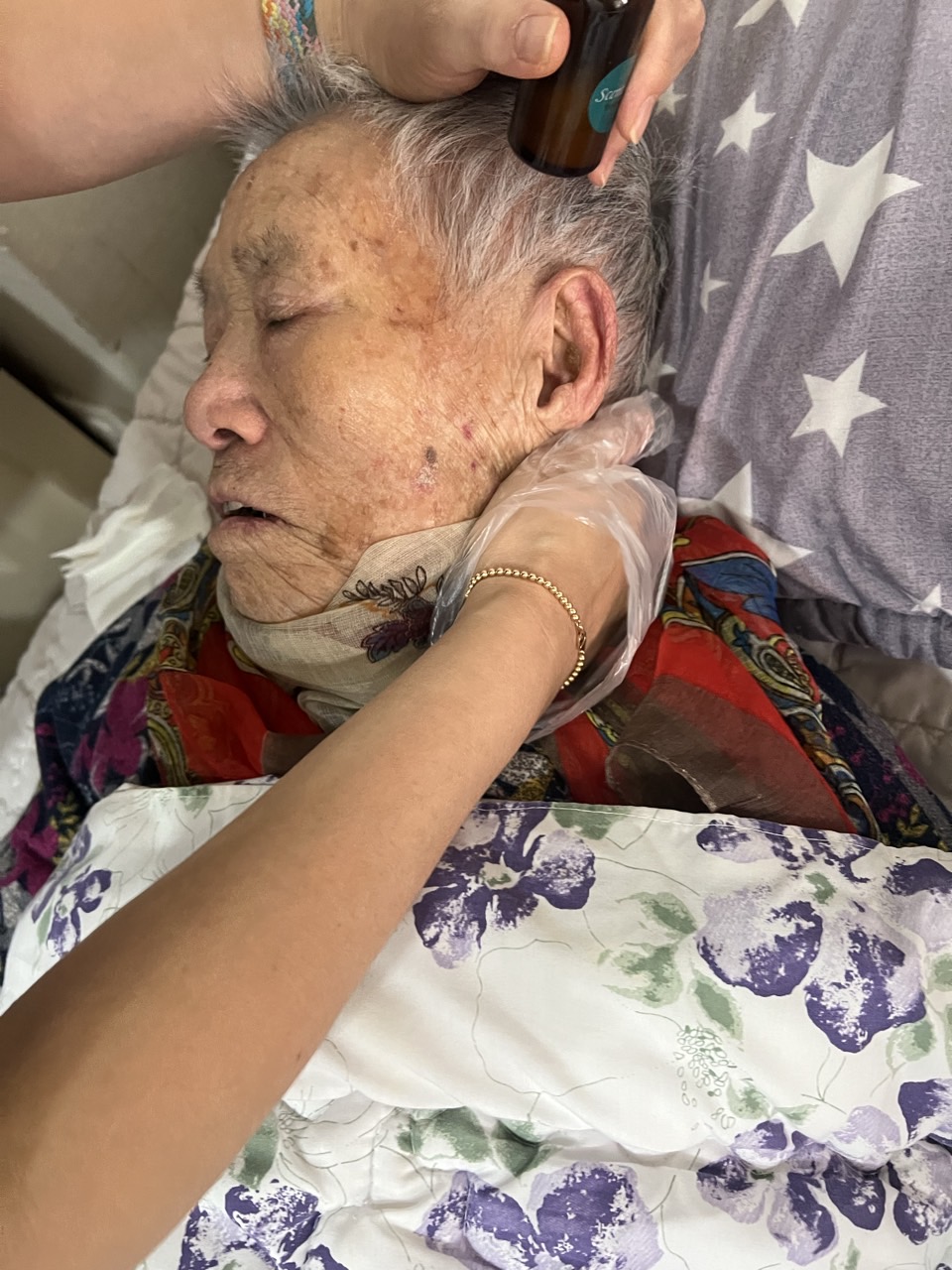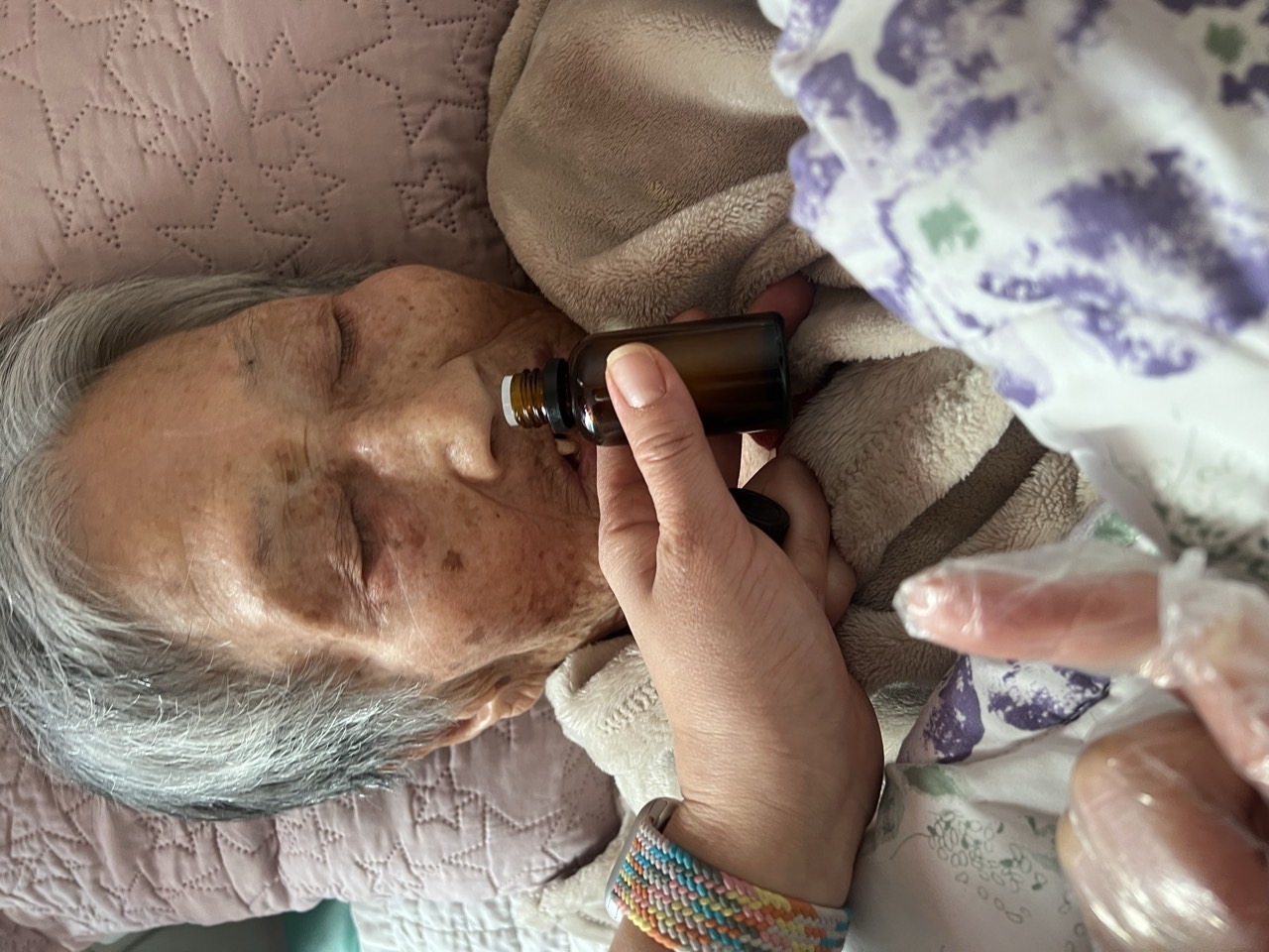 ② 진행 : 코에 오일 냄새를 맡게 하고, 관자놀이에 롤링기법으로 마사지를 해준다.