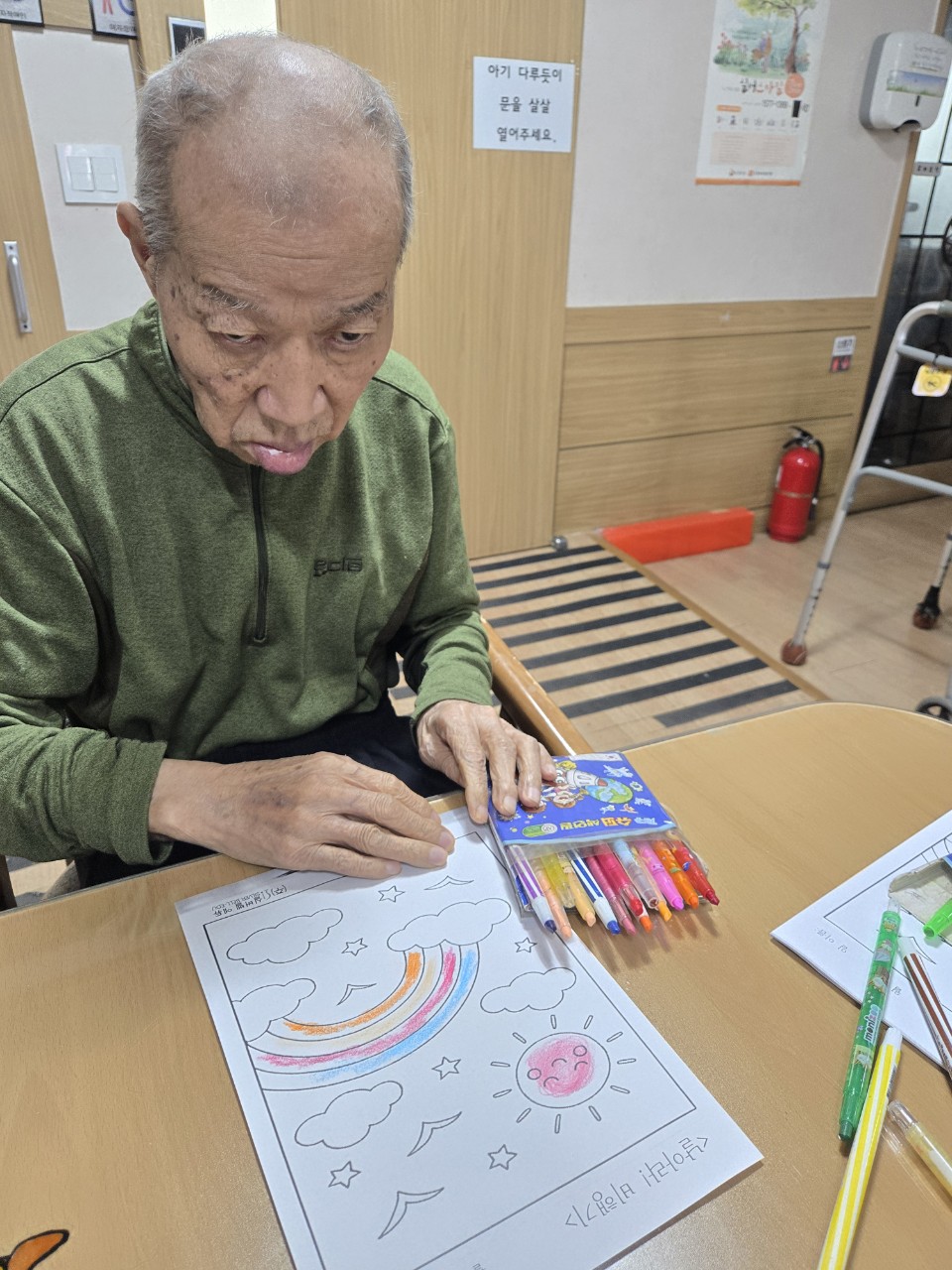 2. 준비된 그림도안과 색연필을 어르신께서 만져보게 한다.
