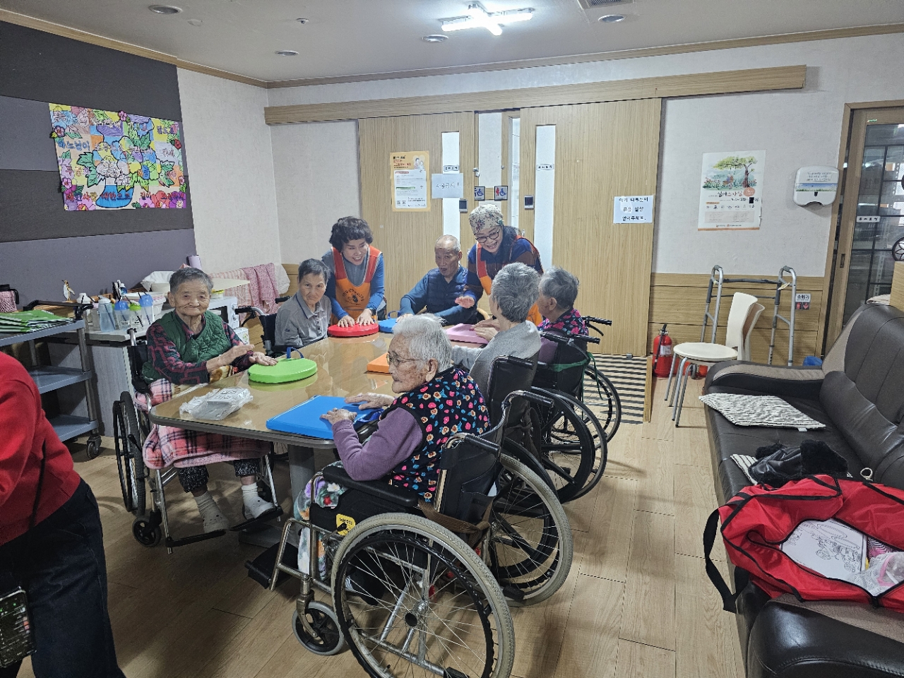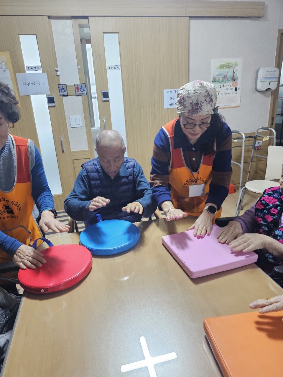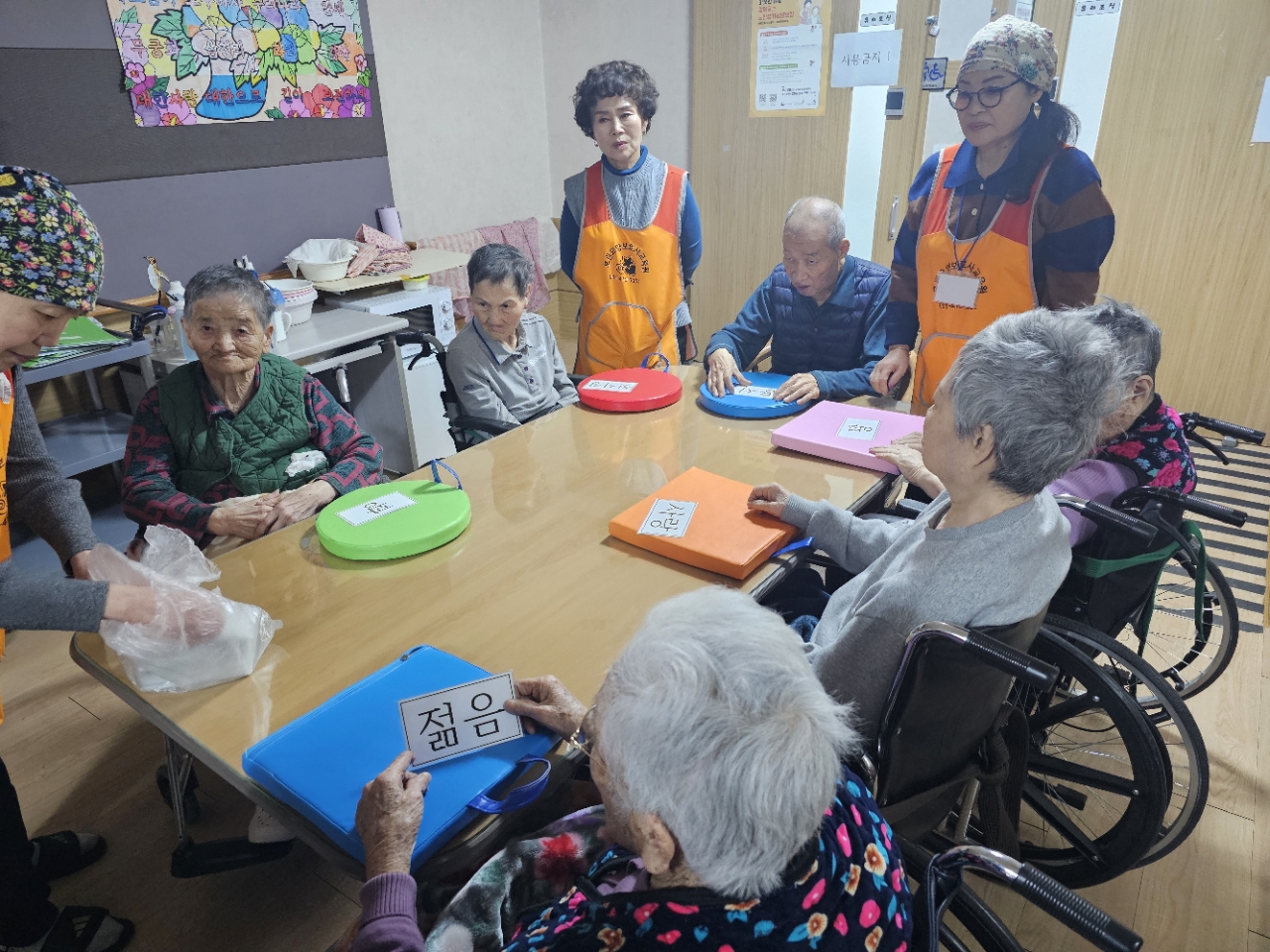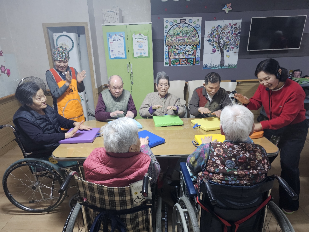 어르신들을 프로그램실로 모신 후 다 같이 인사를 하고 맨손체조를 하며 근육을 풀어줍니다.