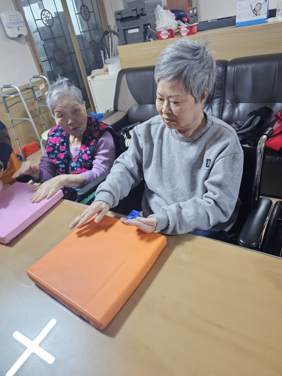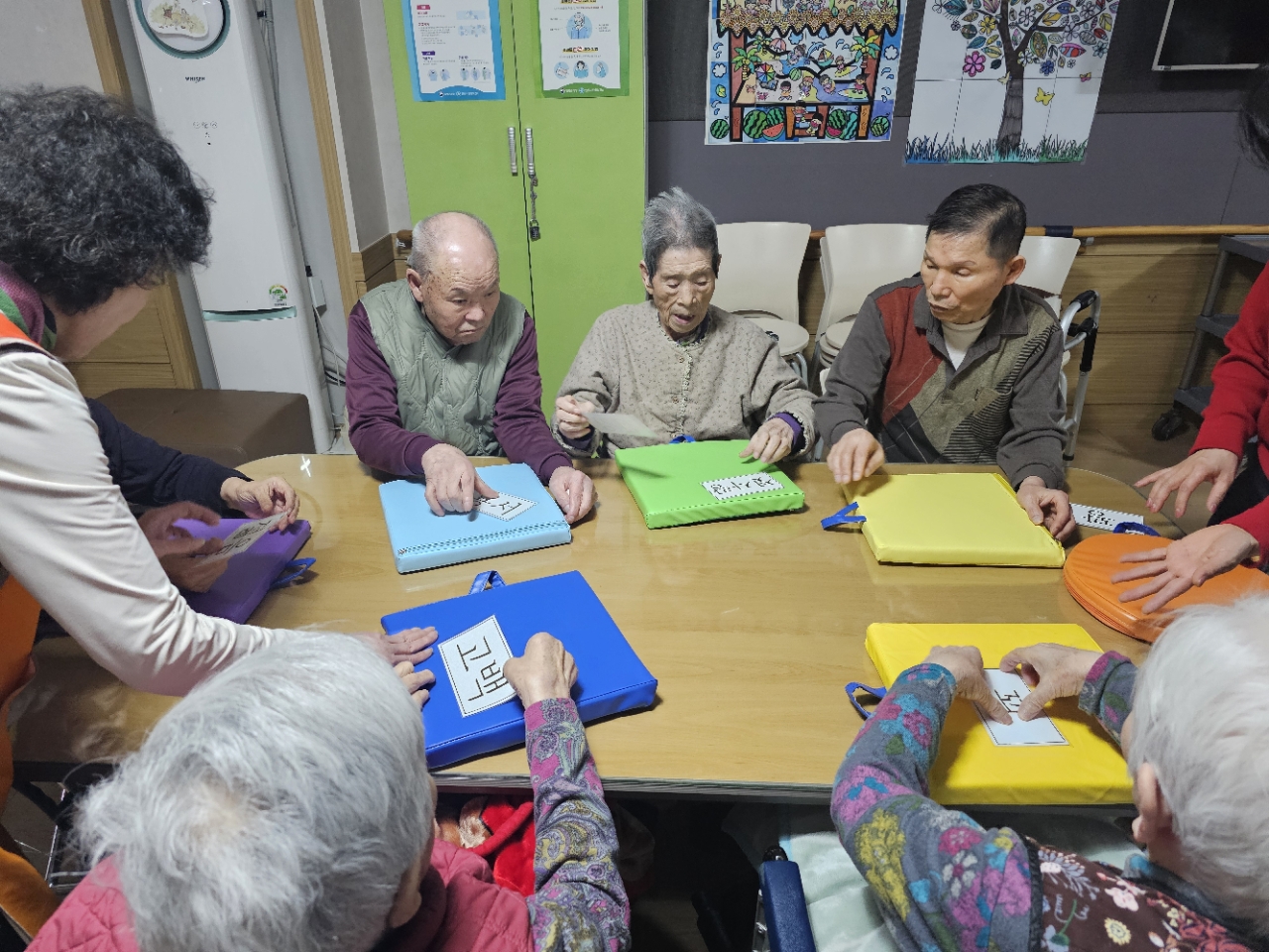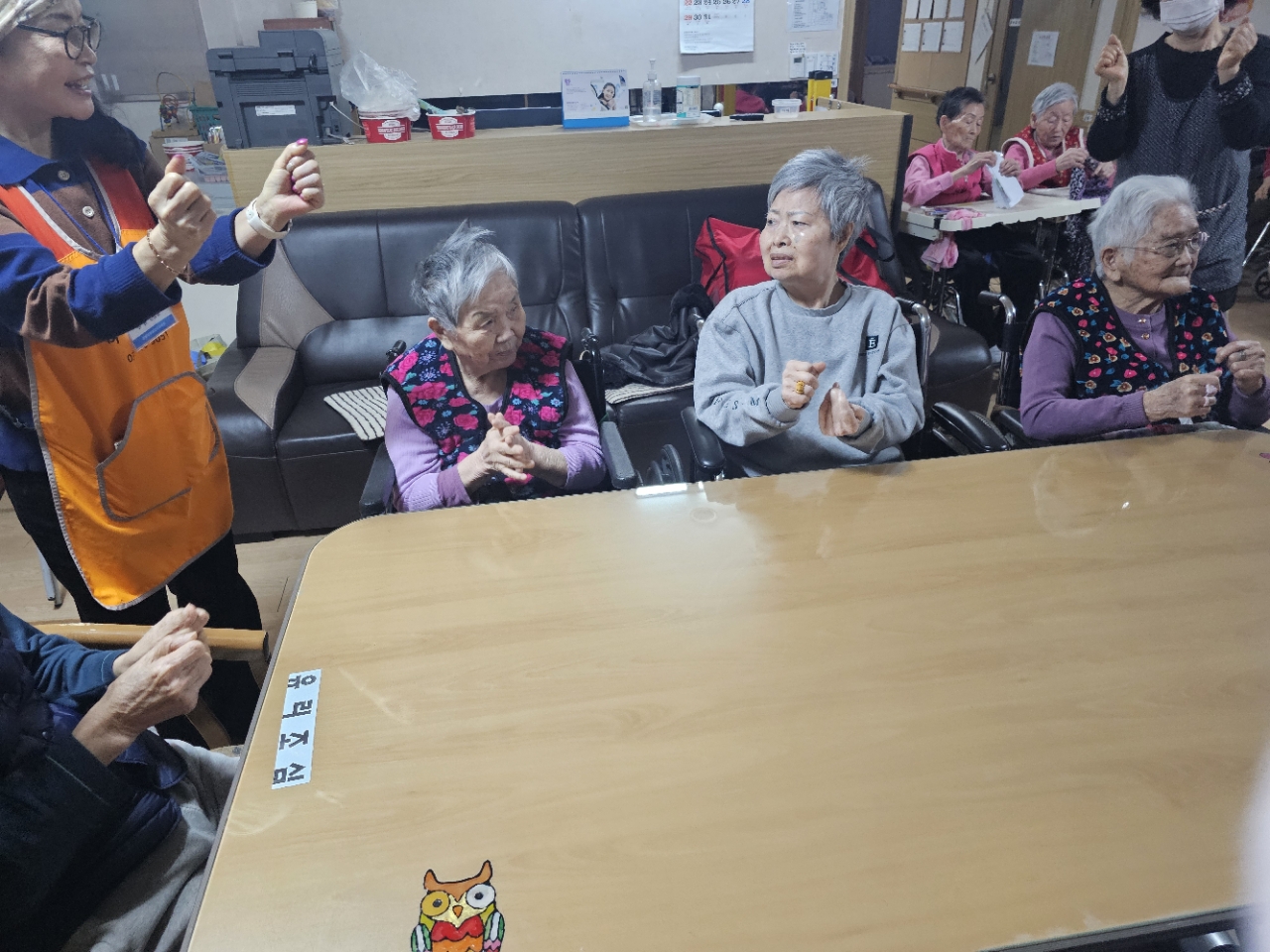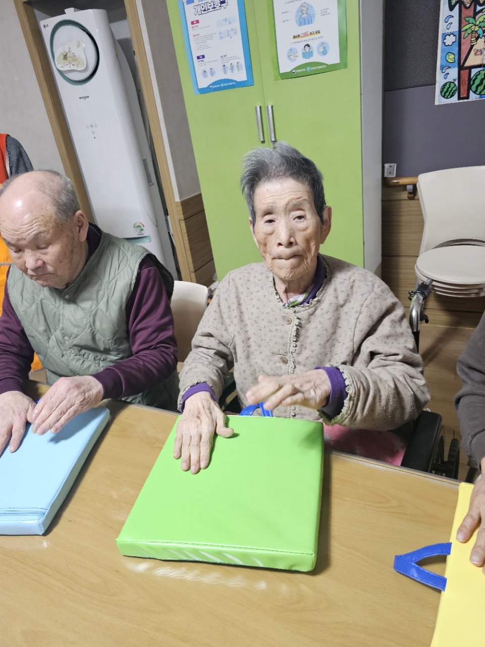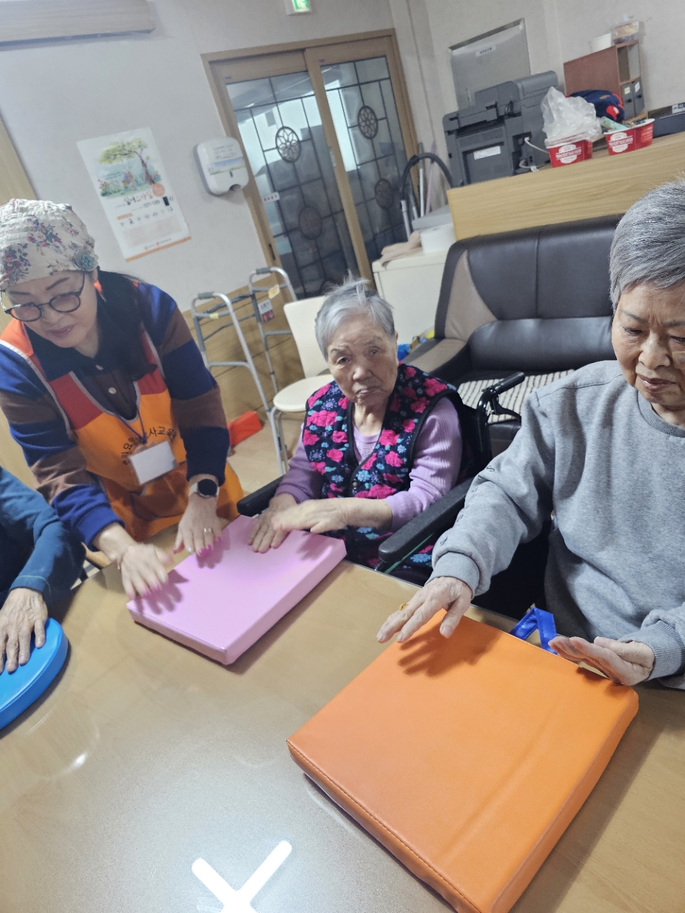 어르신들을 프로그램실로 모신 후 다 같이 인사를 하고 맨손체조를 하며 근육을 풀어줍니다.