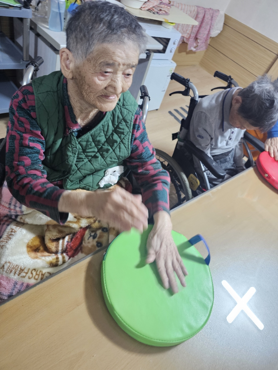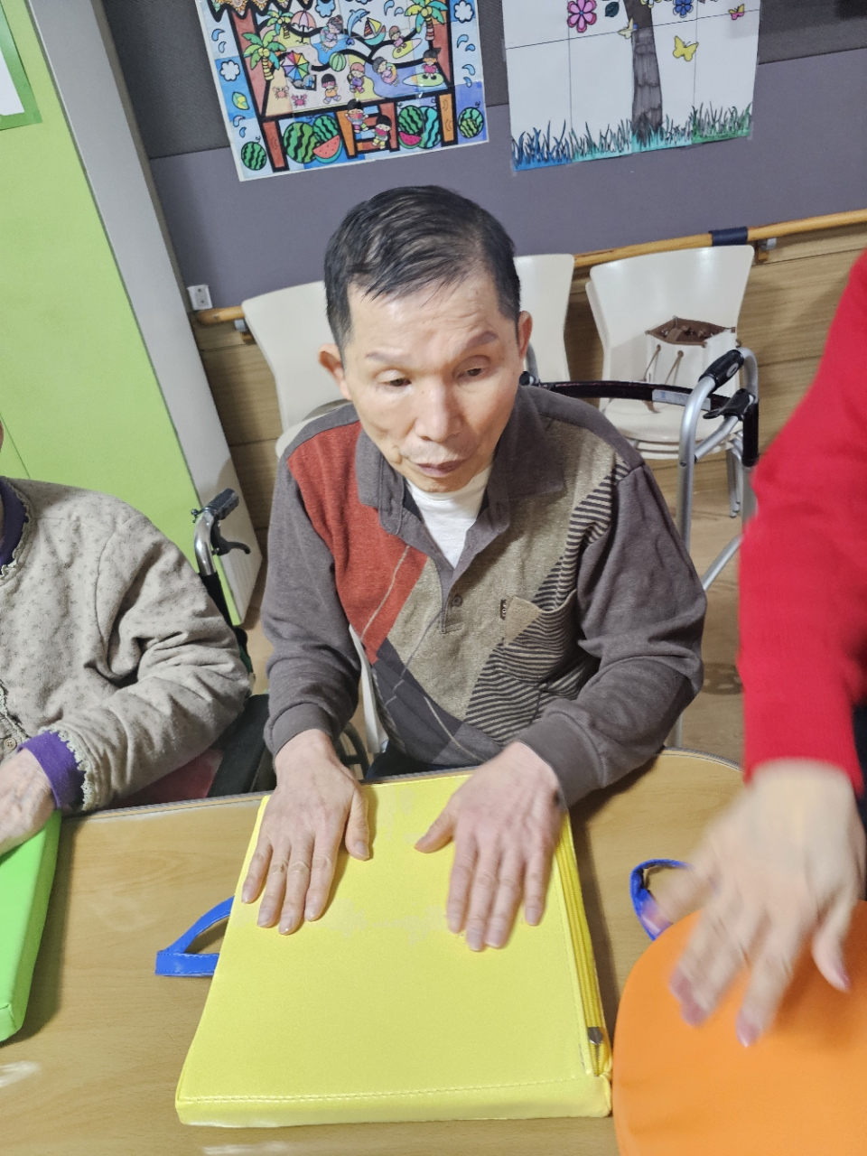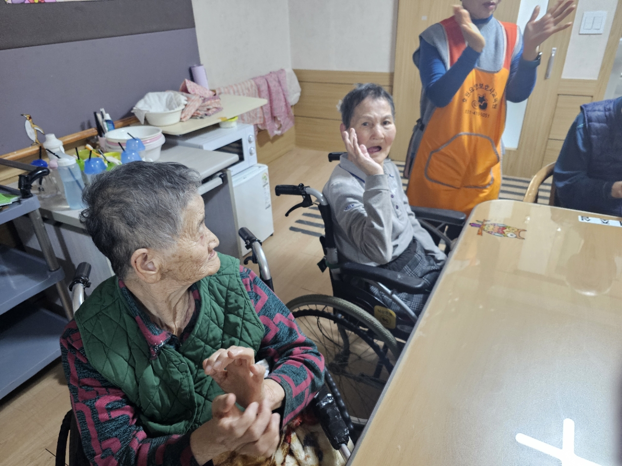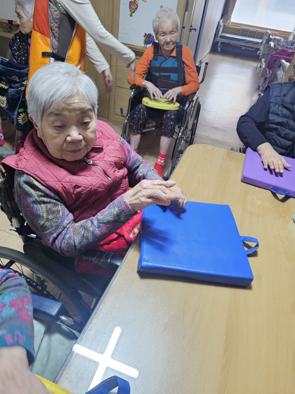 어르신들을 프로그램실로 모신 후 다 같이 인사를 하고 맨손체조를 하며 근육을 풀어줍니다.