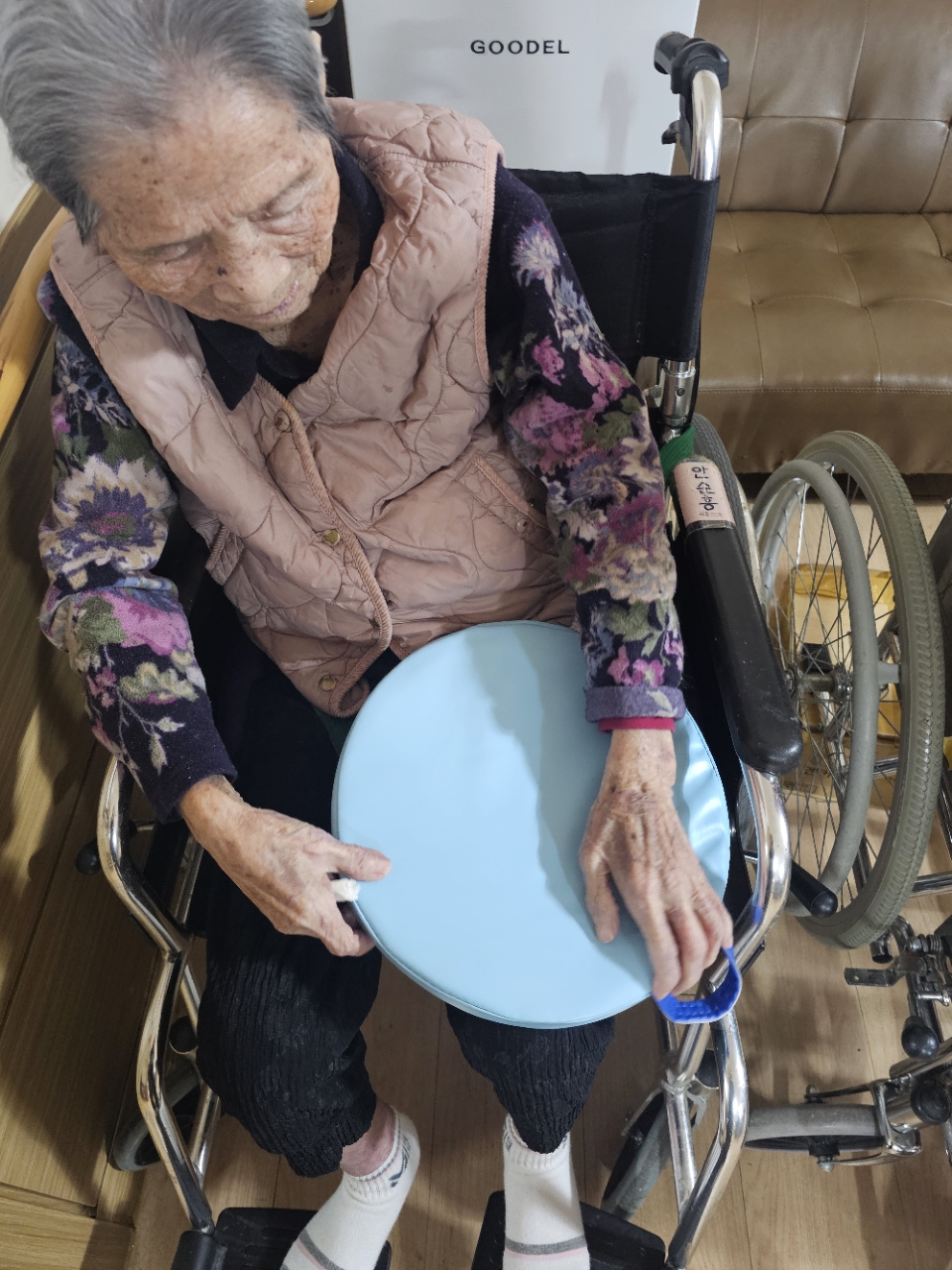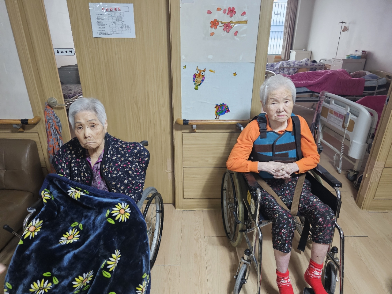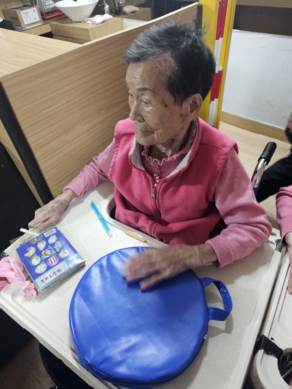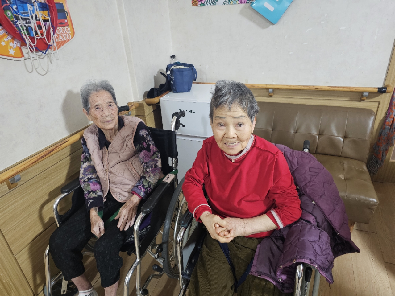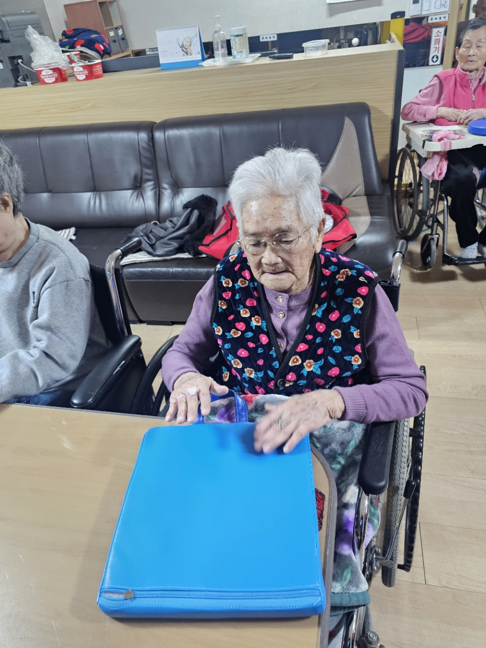 어르신들을 프로그램실로 모신 후 다 같이 인사를 하고 맨손체조를 하며 근육을 풀어줍니다.
