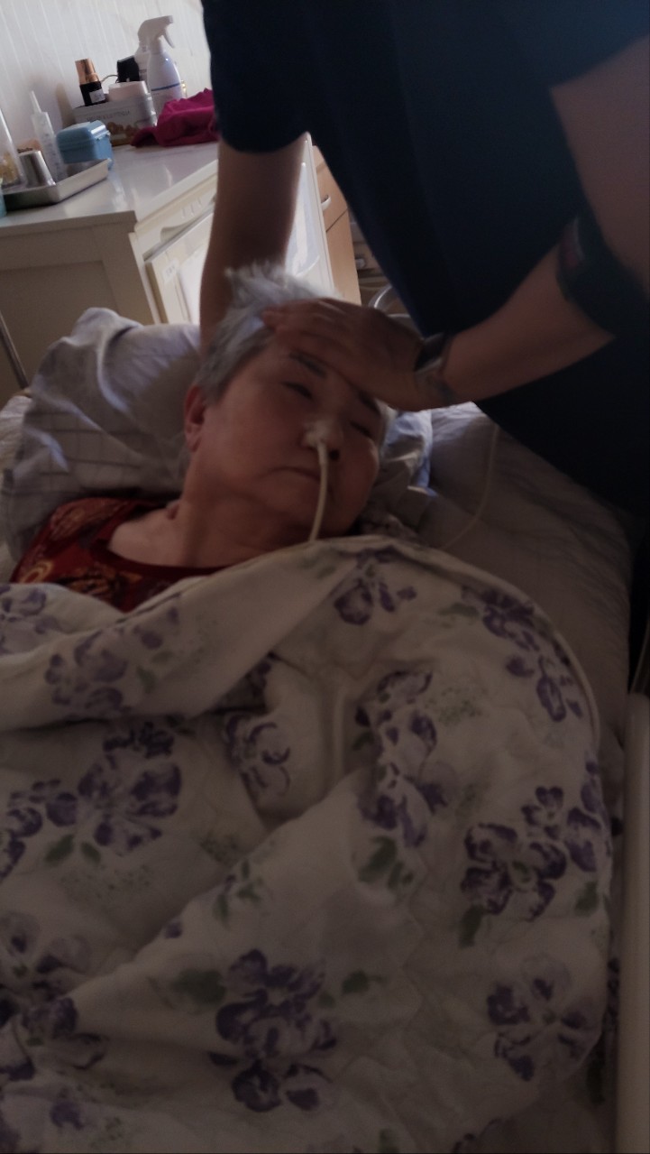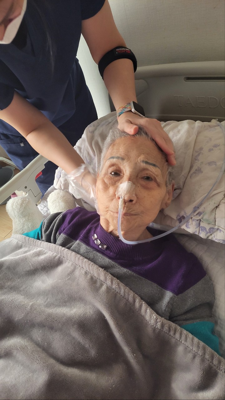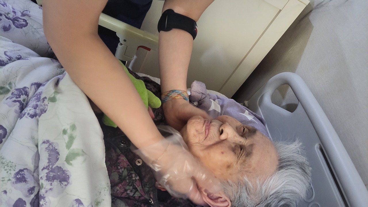 ② 진행 : 코에 오일 냄새를 맡게 하고, 관자놀이에 롤링기법으로 마사지를 해준다.