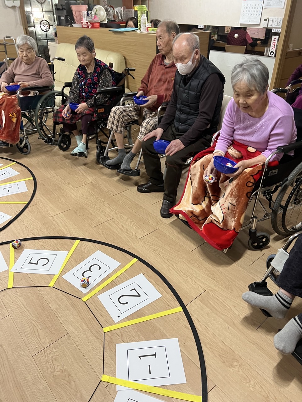 여러 개의 원형 공간이 연결된 사다리안에 써있는 숫자에 오자미를 던져서 원하는 위치에 넣어볼 수 있습니다.