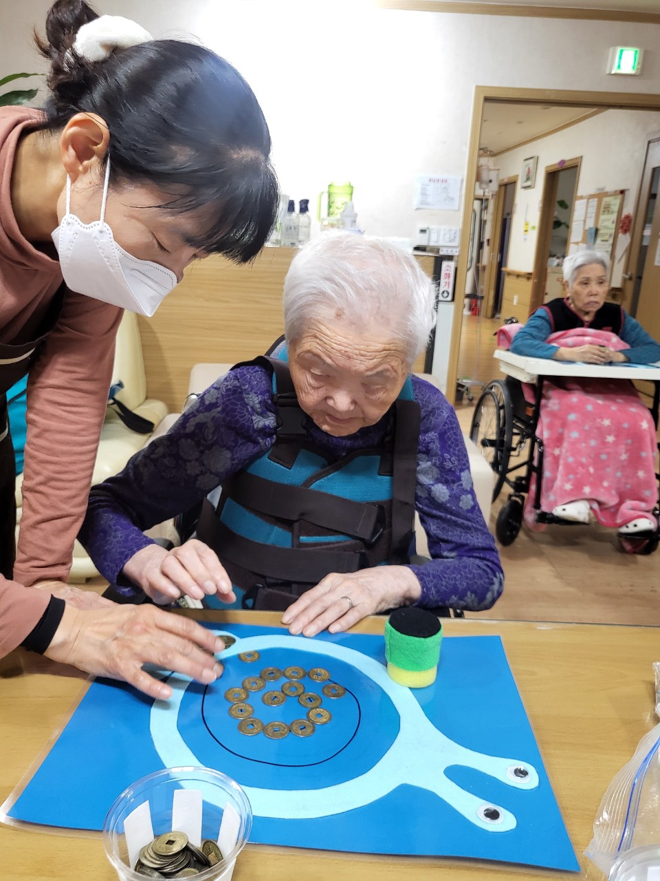 옛날에 사용했던 엽전으로 꿰고 쌓고 올리기 긁기 활동들을 수행한다.