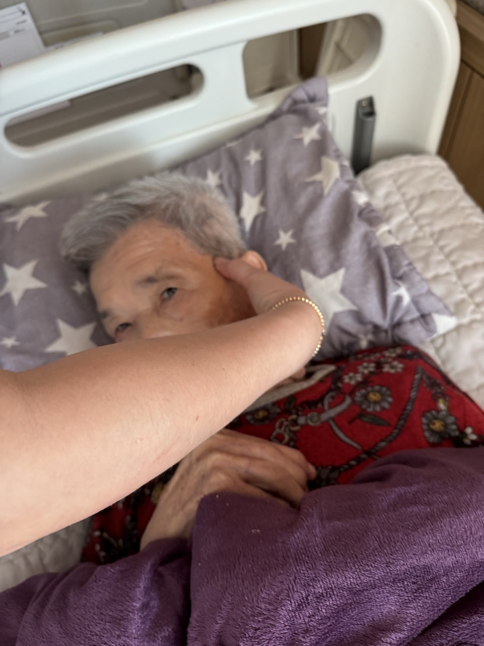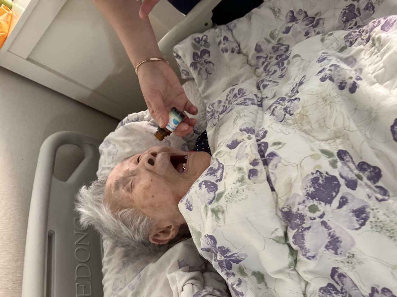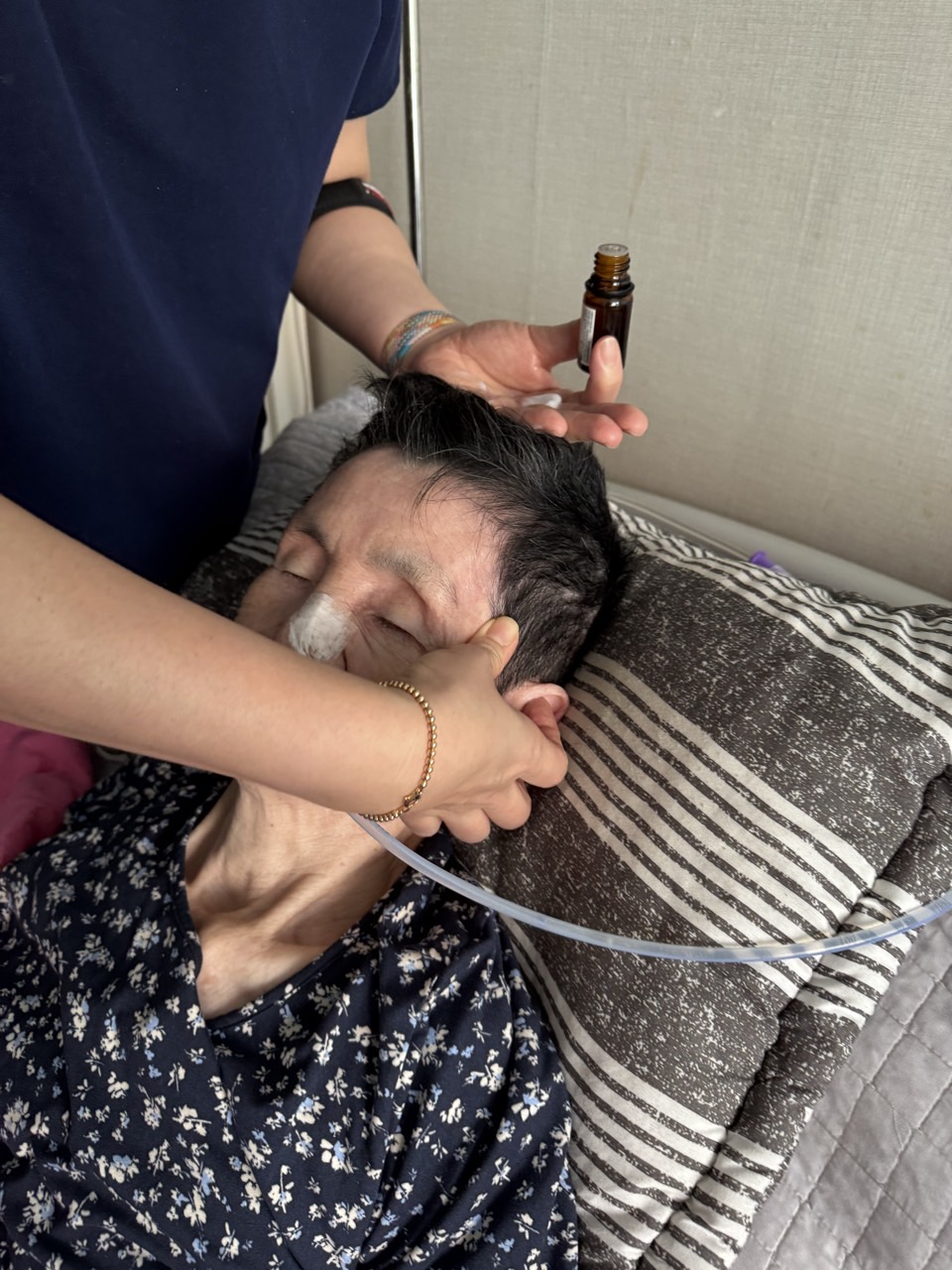 ② 진행 : 코에 오일 냄새를 맡게 하고, 관자놀이에 롤링기법으로 마사지를 해준다.