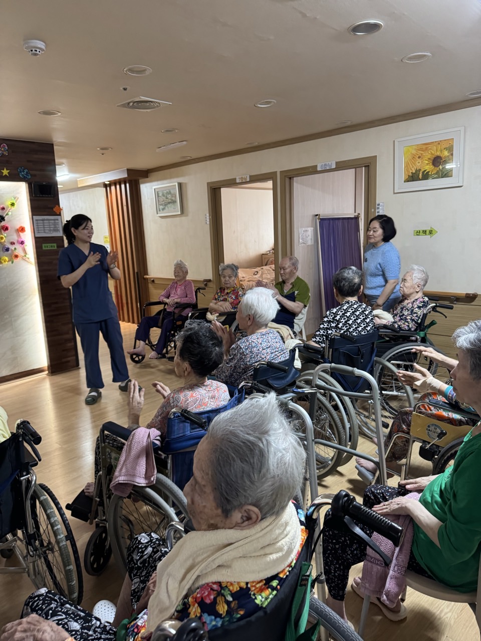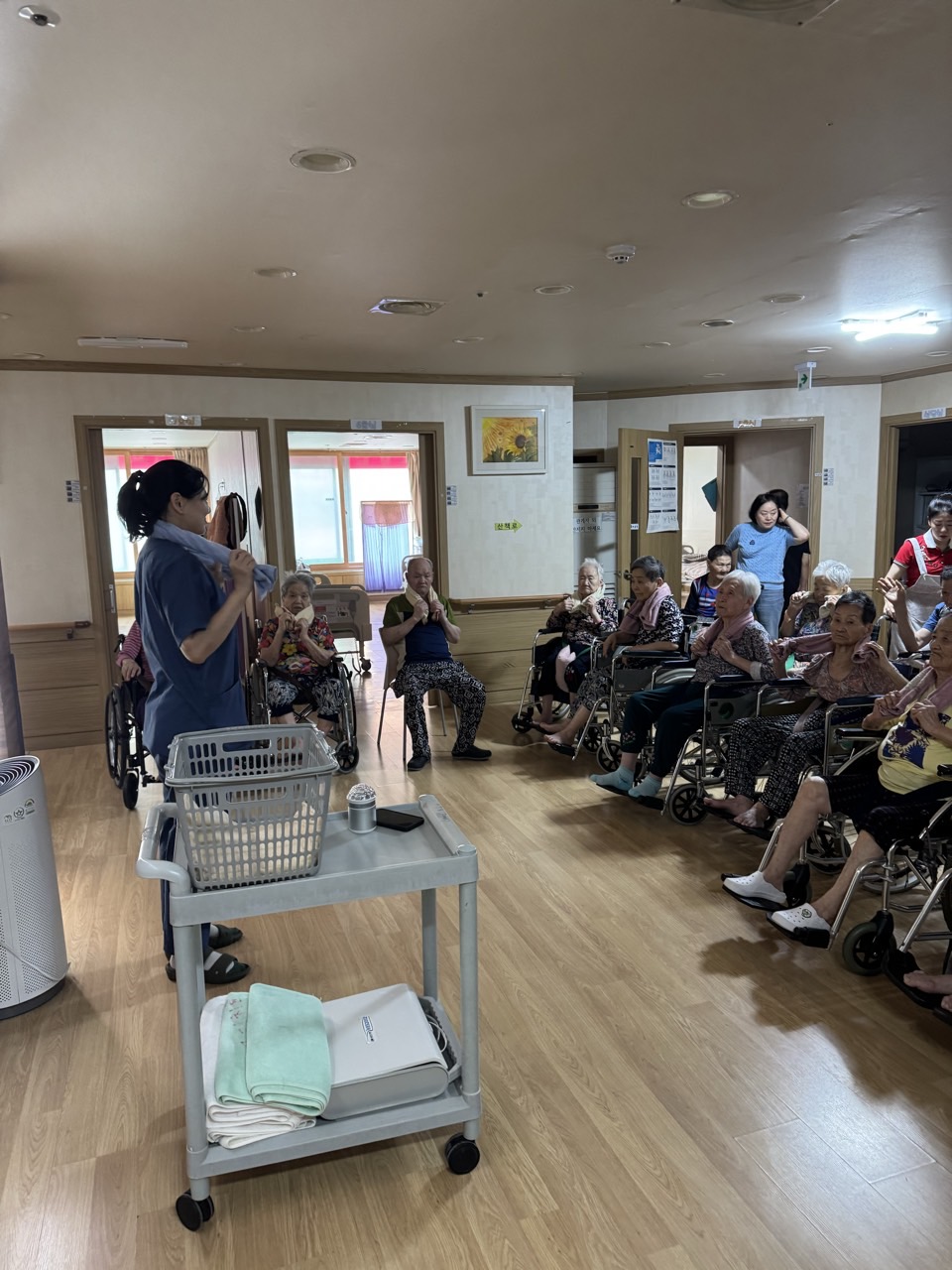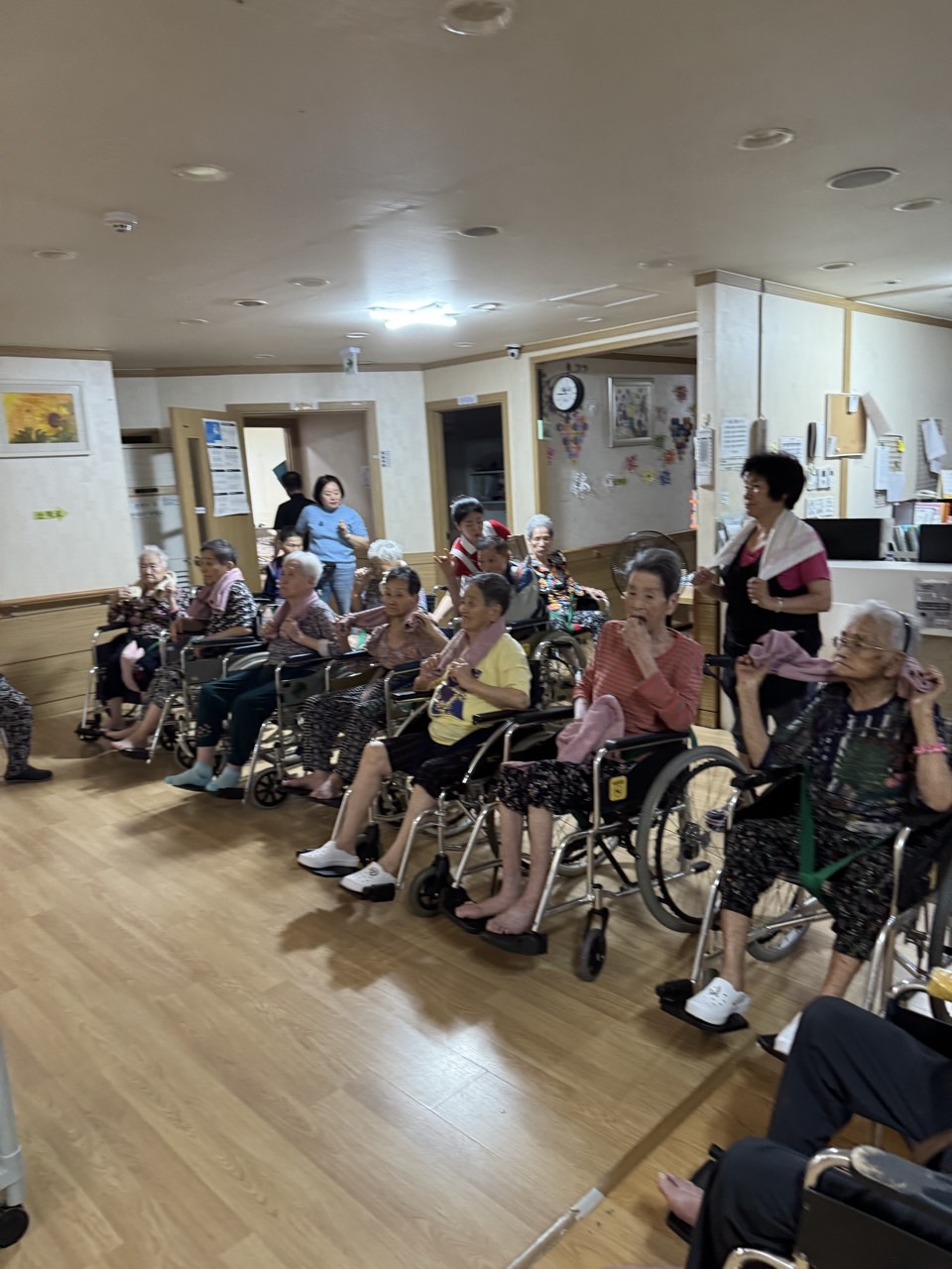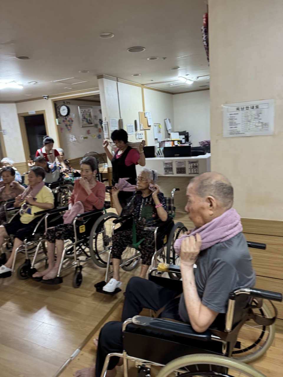 ① 어르신들을 중앙홀로 모신다. (모시기 힘든 어르신을 각 방으로 찾아간다.)