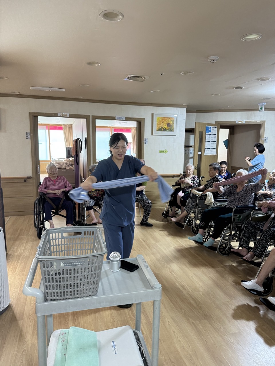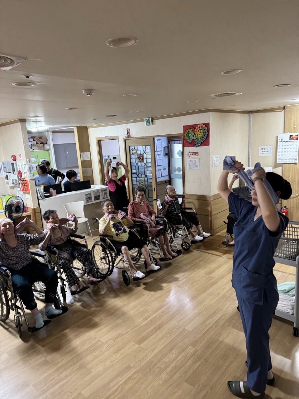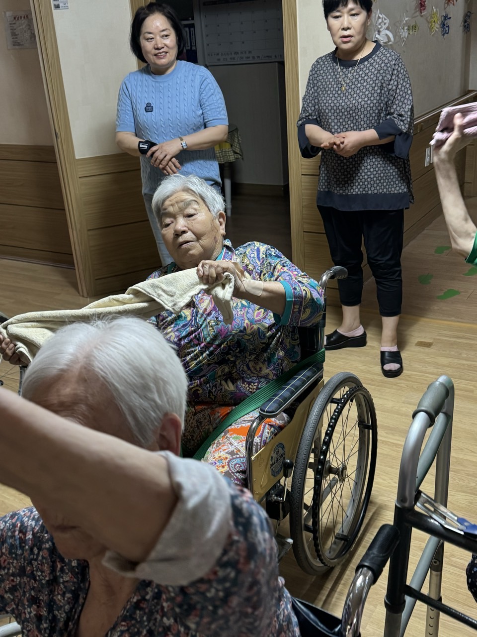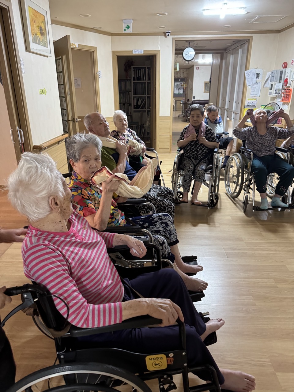 ① 어르신들을 중앙홀로 모신다. (모시기 힘든 어르신을 각 방으로 찾아간다.)