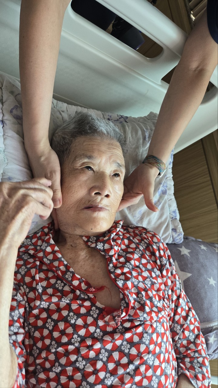 ② 진행 : 코에 오일 냄새를 맡게 하고, 관자놀이에 롤링기법으로 마사지를 해준다.
