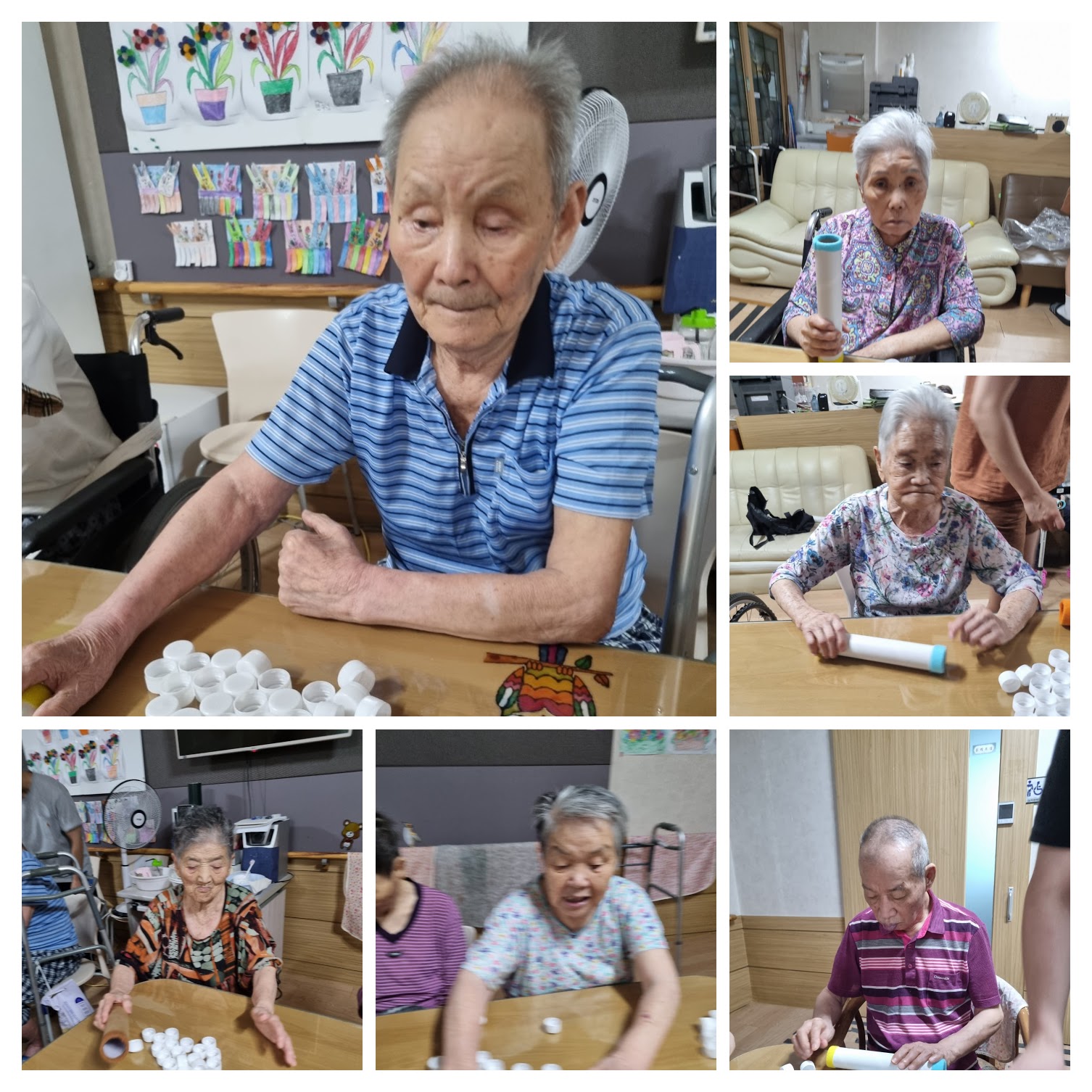 어르신들께서 지관으로 마사지를 시원하게 하시고, 롤링하며 요리 흉내도 내시고 병뚜껑을 밀고 쌓으시면서 즐겁게 수업하셨습니다. ^^