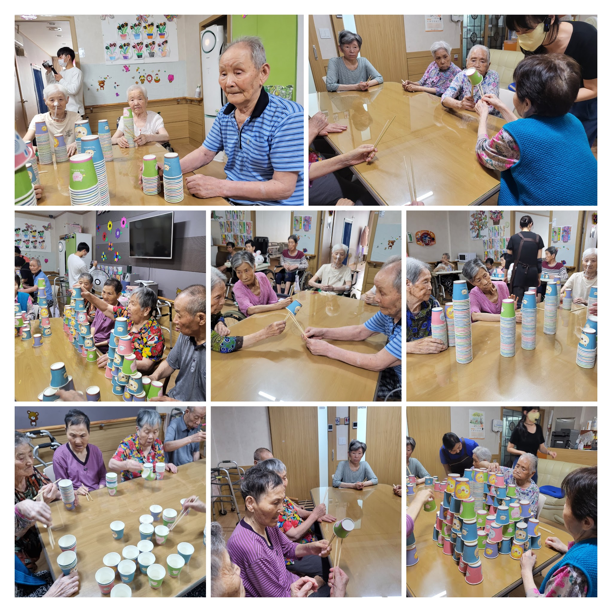 젓가락으로 컵을 서로에게 옮기기를 너무 잘 하셨고, 컵을 쌓고 방울을 넣어 흔들기까지 잘 하셨습니다.