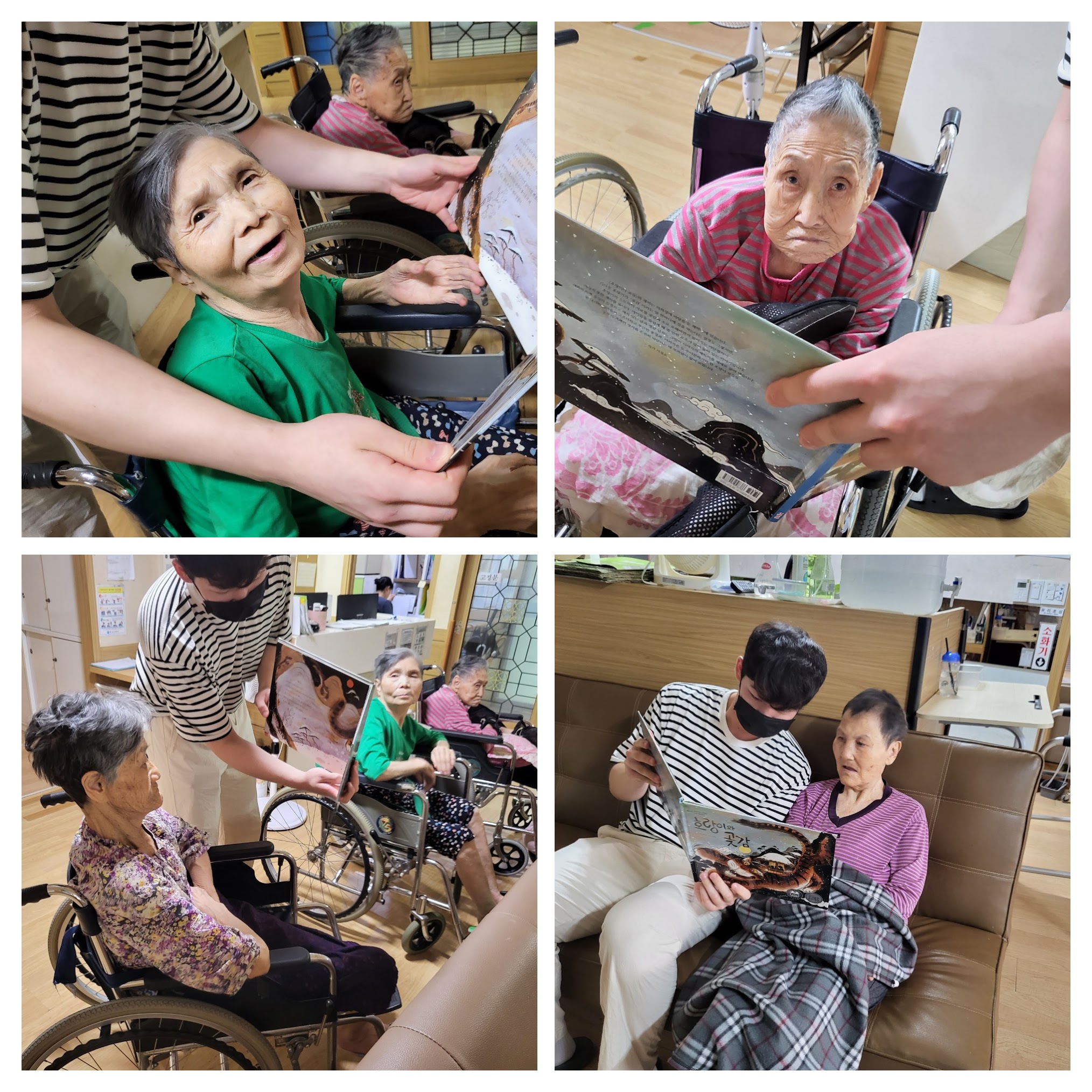 동화책을 보시며 글을 스스로 읽어보시려고 하시며 동화책에 그려져 있는 그림을 매우 좋아하셨습니다