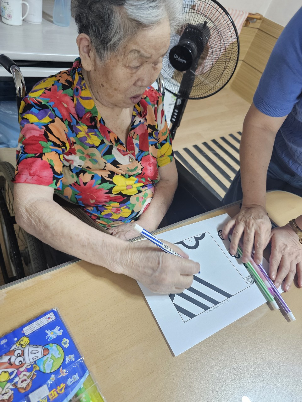 2. 준비된 그림도안과 색연필을 어르신께서 만져보게 한다.