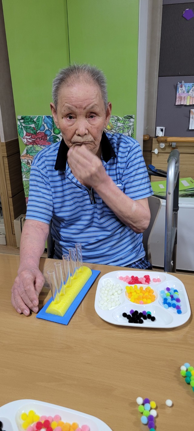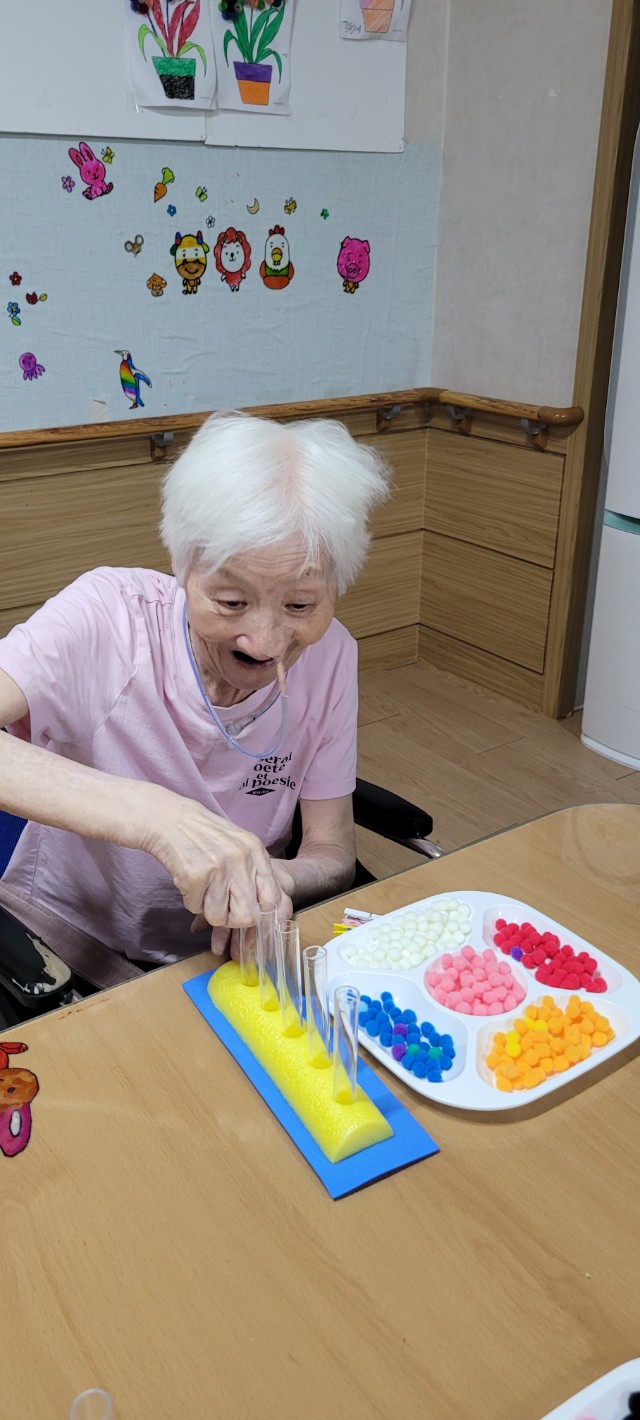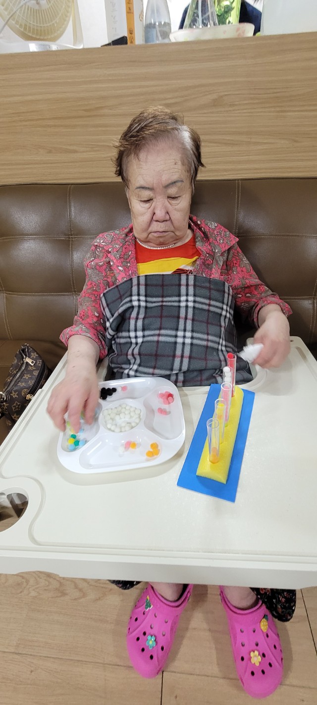솜구슬로 꽃, 인형, 자기이름등 수 놓아보시고, 비커에 넣어 색깔인지와 스피드 게임을 즐겁게 해보셨습니다. ^^