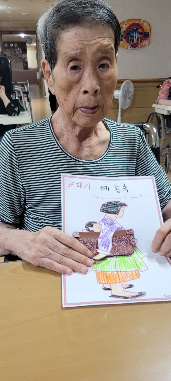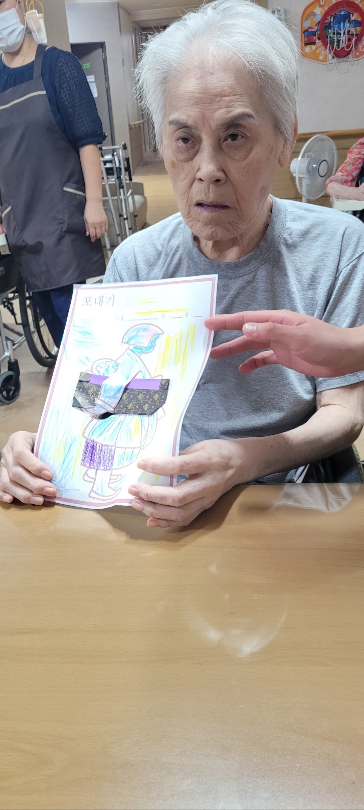 옛날을 회상하며 포대기로 아이를 키웠던 이야기를 나누고 색칠하고 오려붙이면서 구성력이 좋아집니다 ^^