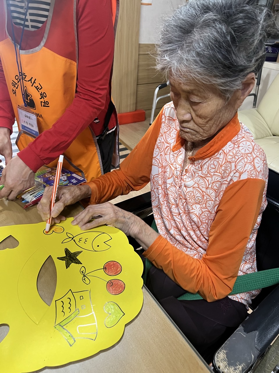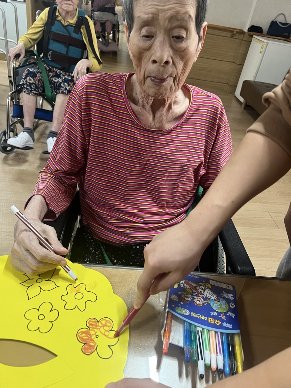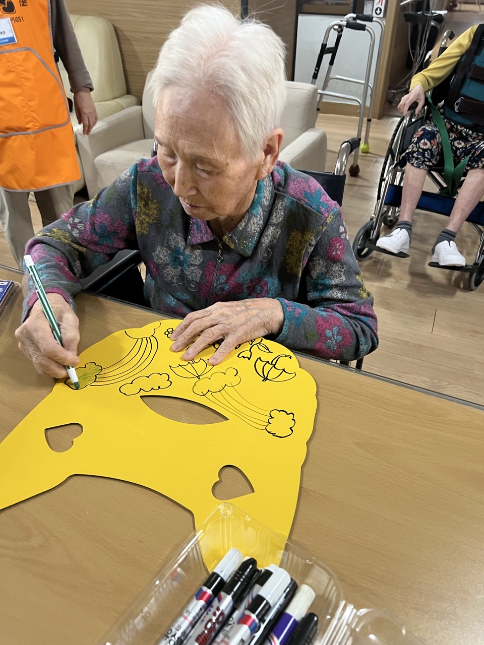 매직으로 어르신들만의 선을 그리고, 그 위에 스티커로 꾸며본다.