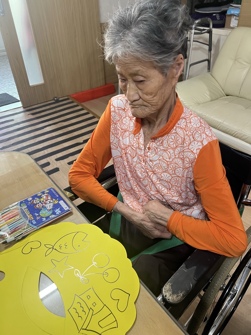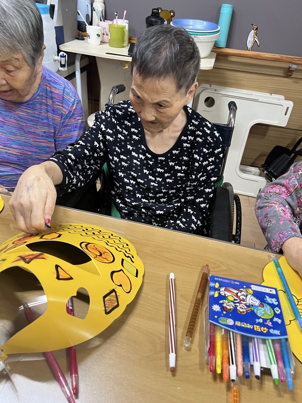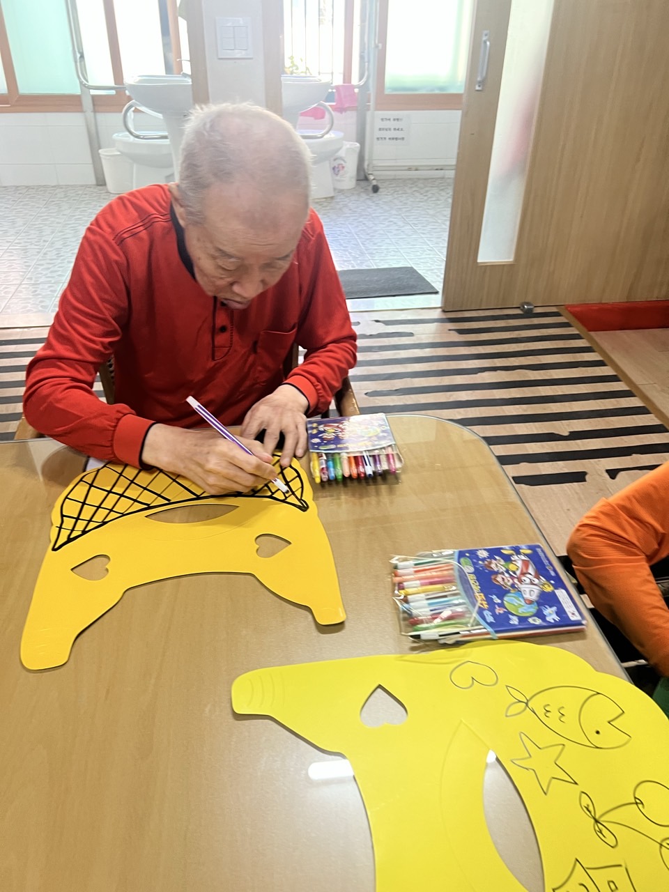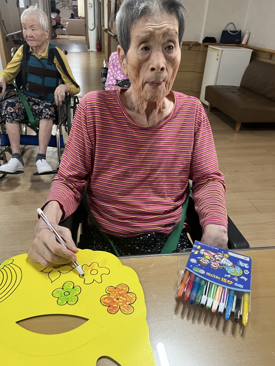 매직으로 어르신들만의 선을 그리고, 그 위에 스티커로 꾸며본다.