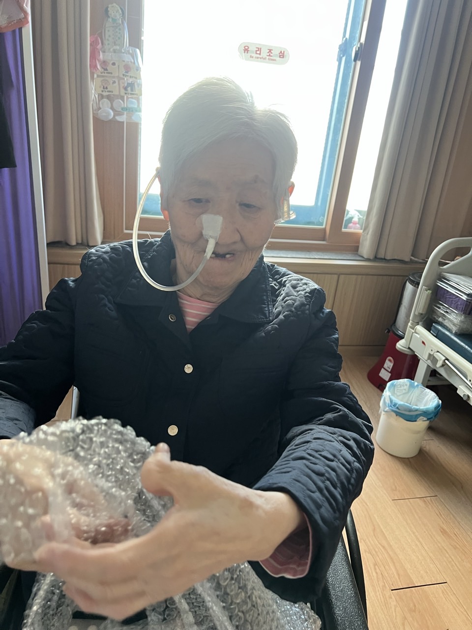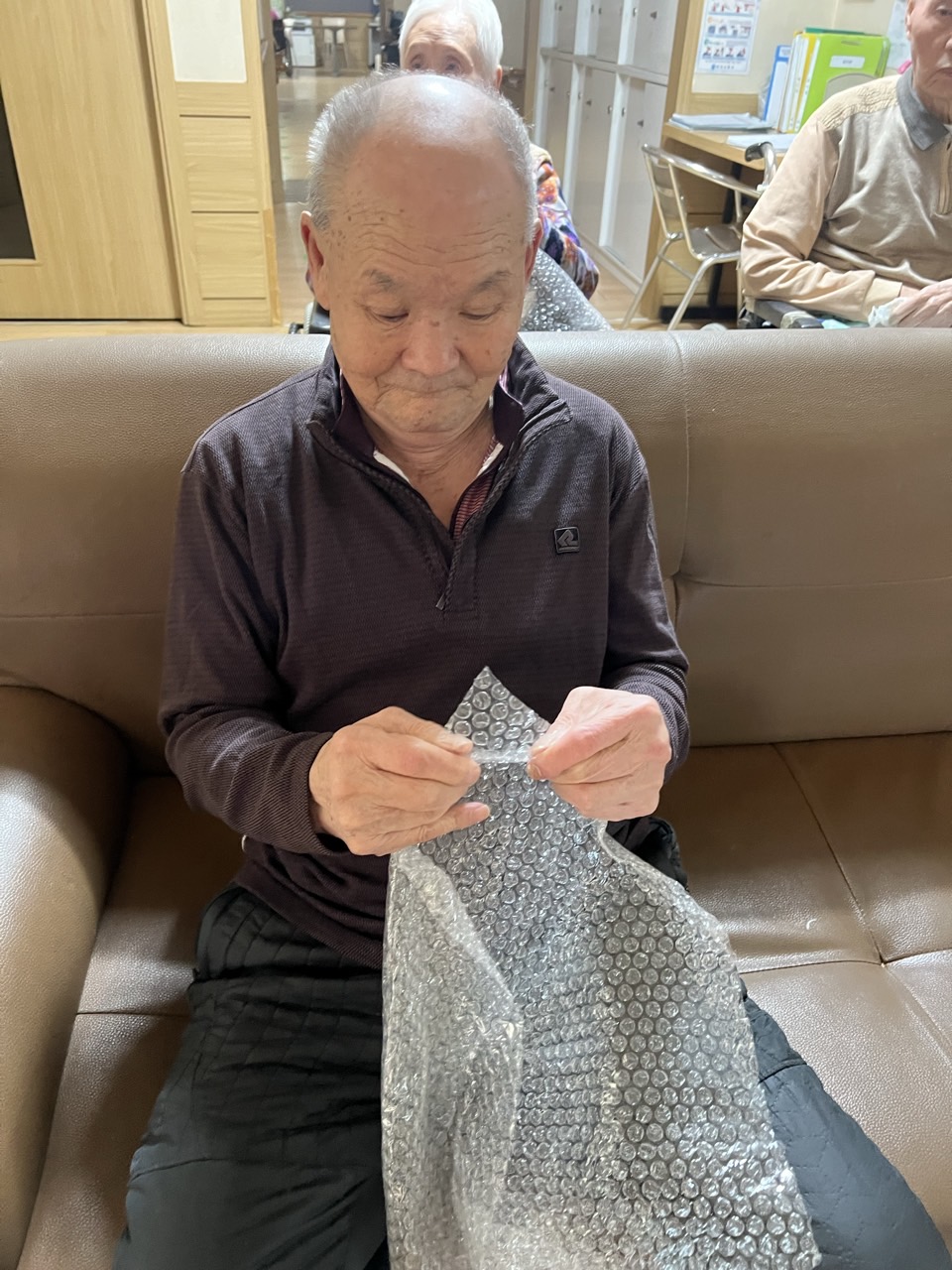 에어캡을 미리 준비하여 어르신들께 나눠 드리고 터트리는 것을 스스로 해보실 수 있도록 해본다.