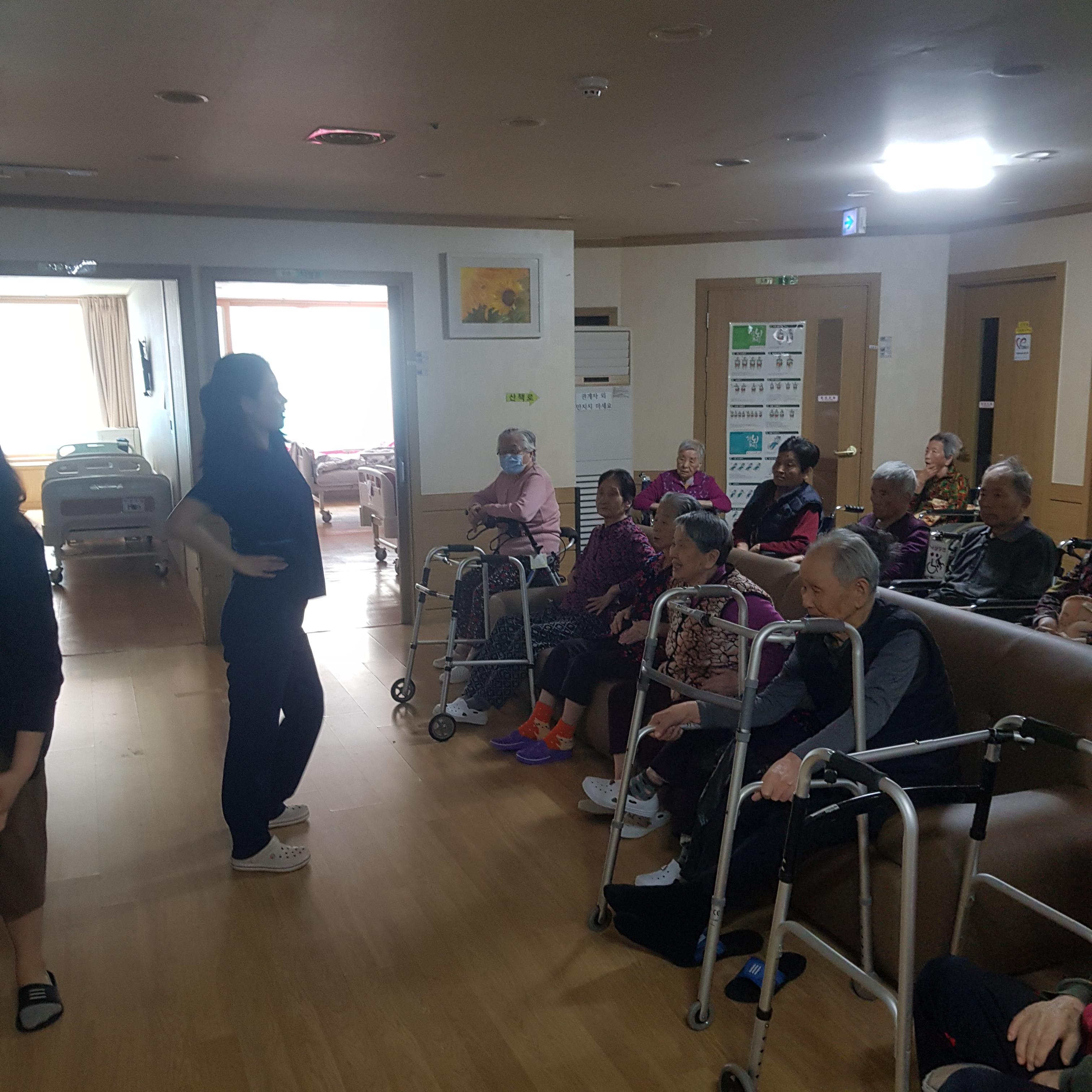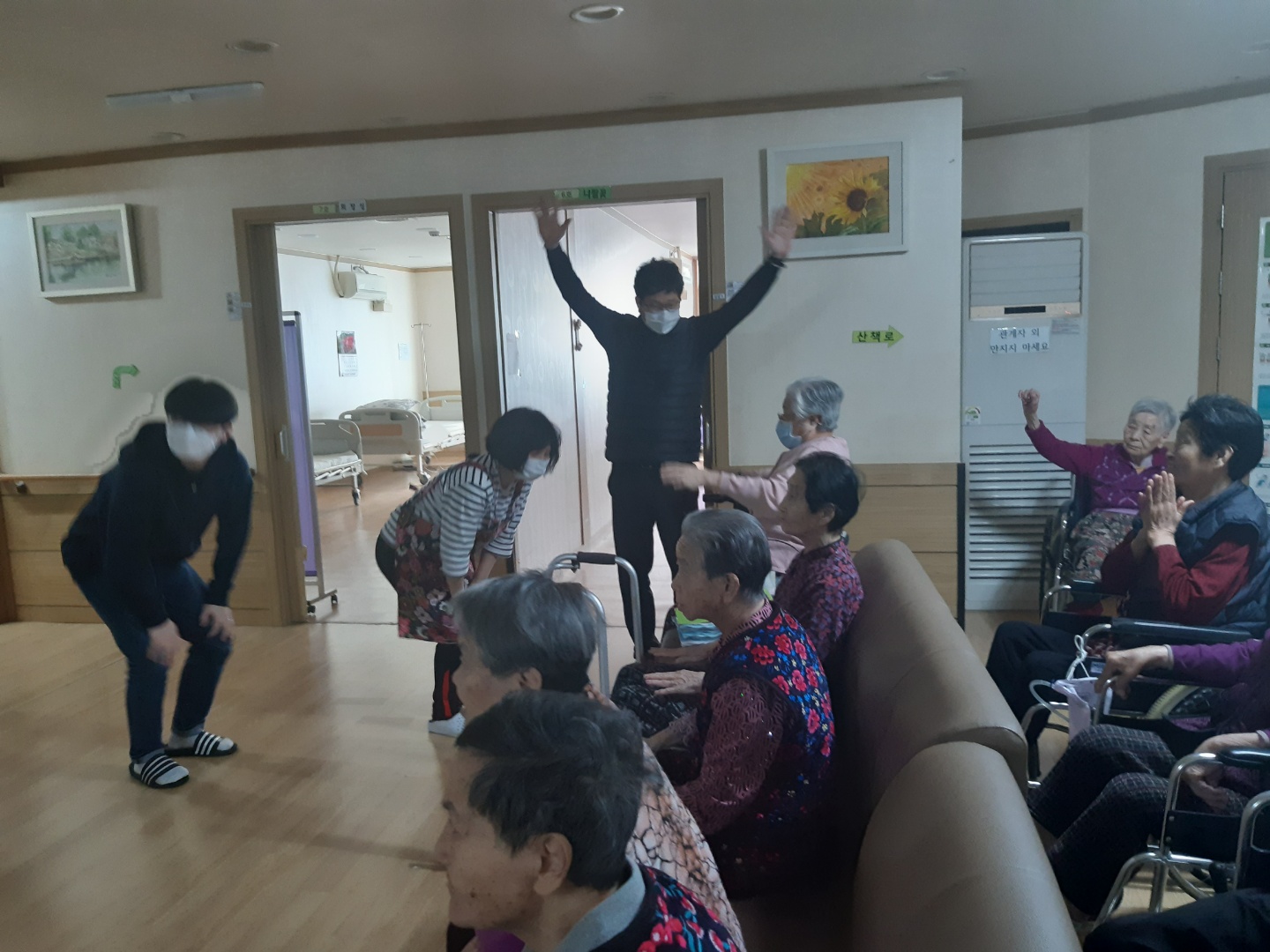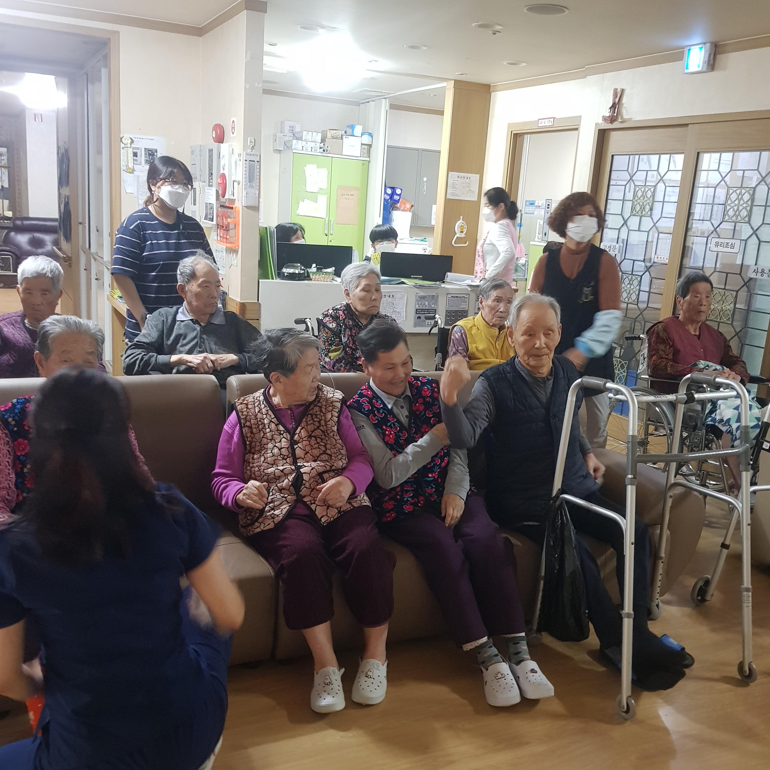손주같은 사회복무요원들과 국민체조를 하시며 즐거워 하셨습니다.