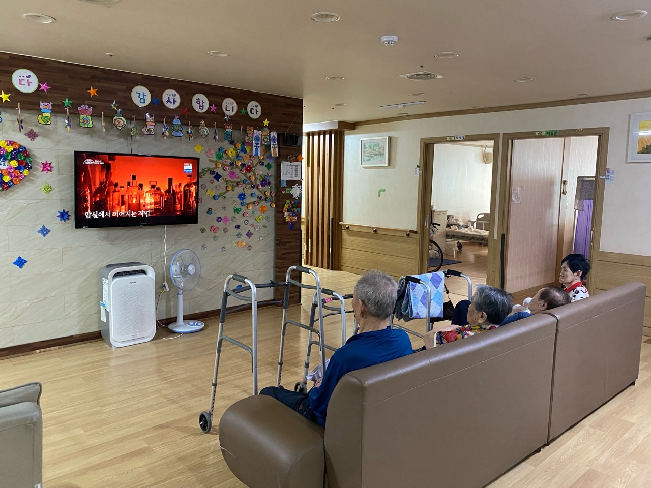 각 방에 tv가 배치되어 있으므로 어르신들께서 원하시는 장소에서 드라마 시청을 하실 수 있도록 하였습니다