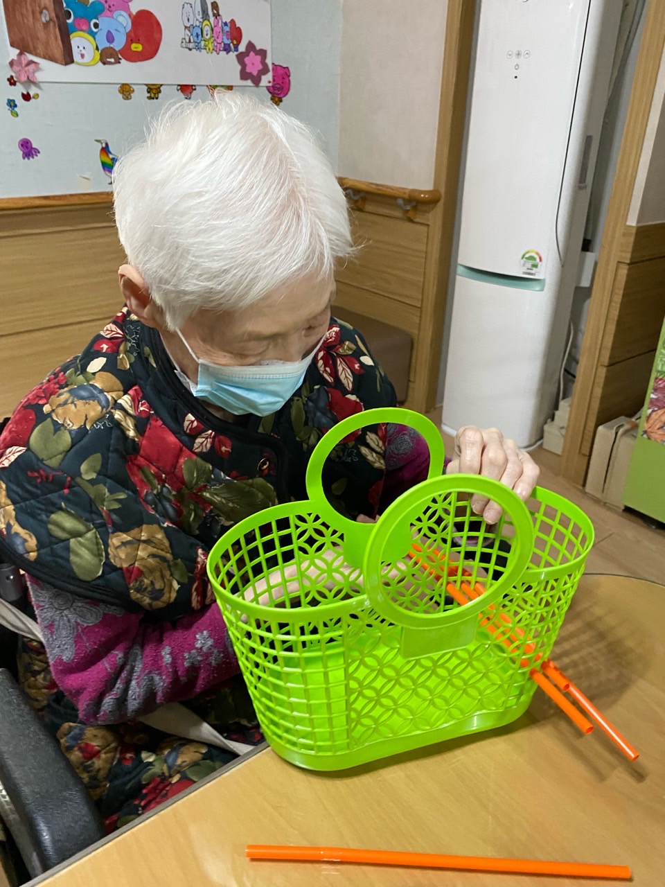 구멍이 많은 바구니에 빨대를 끼워 맞은편 구멍을 찾아 끼우는 미로 찾기 놀이로 공간 개념이 좋아진다