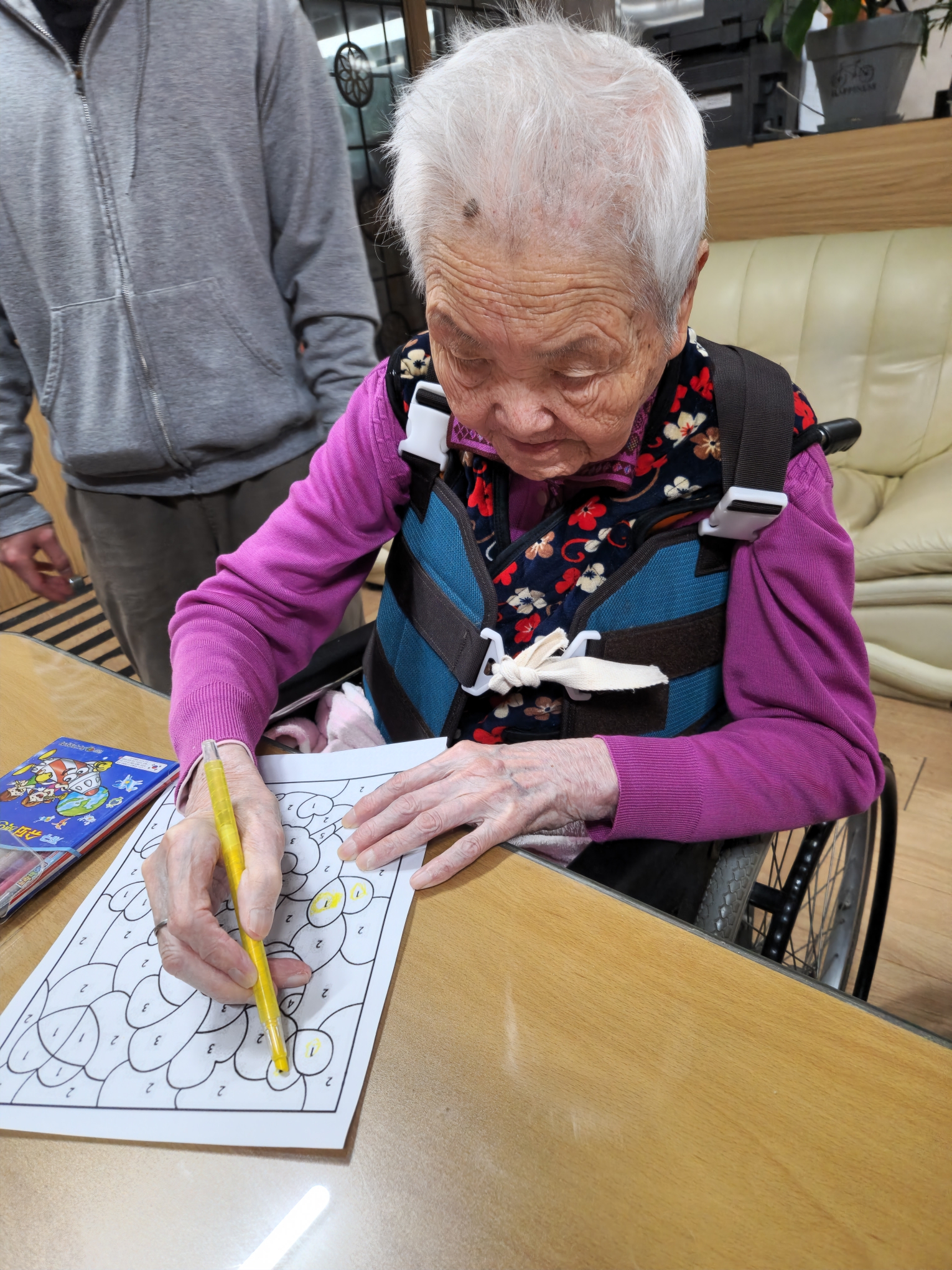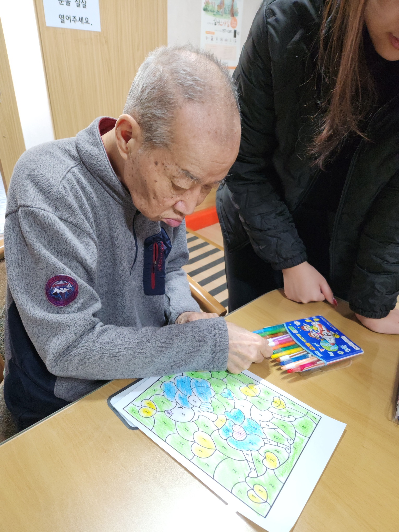 2. 준비된 그림도안과 색연필을 어르신께서 만져보게 한다.