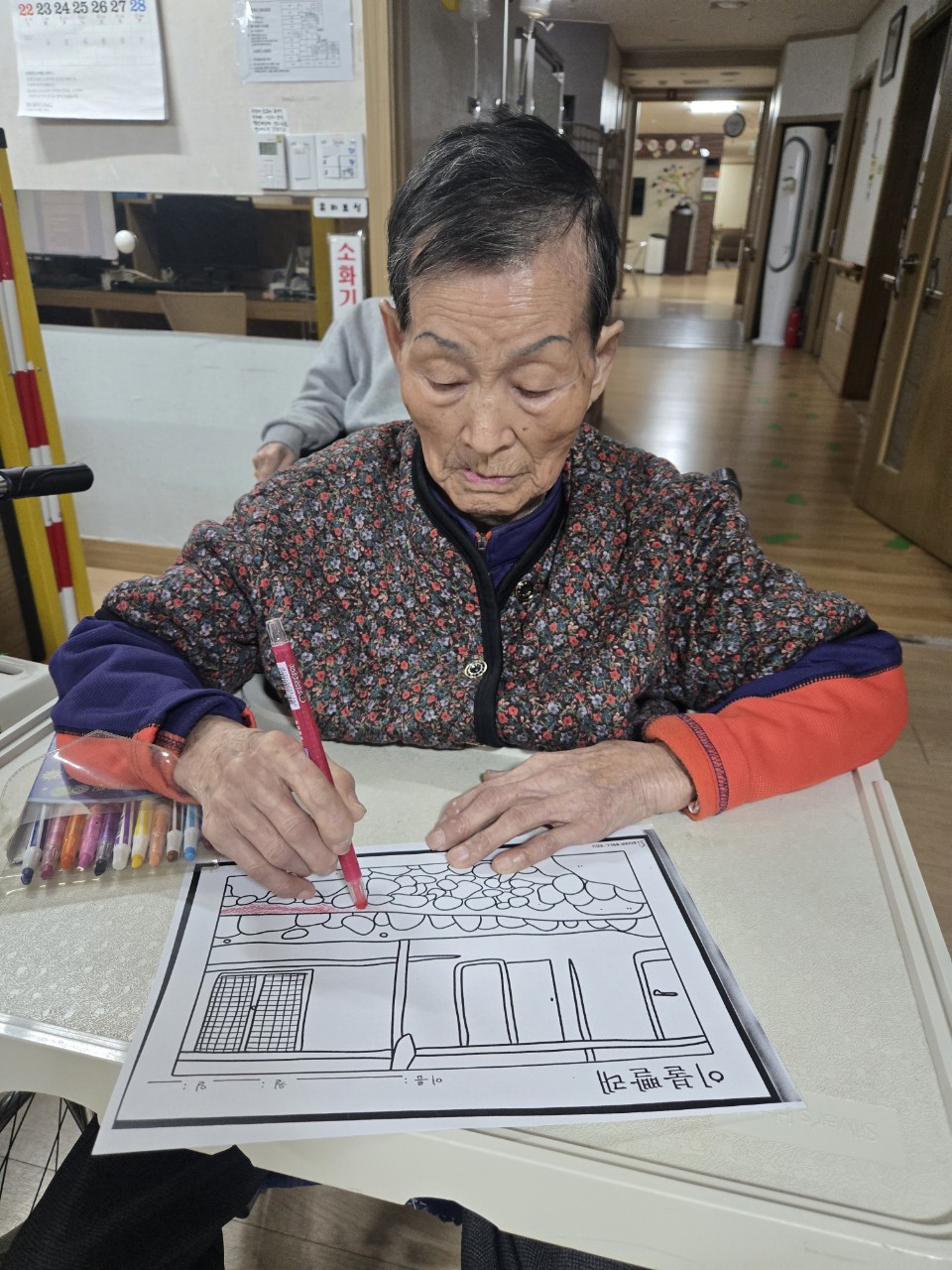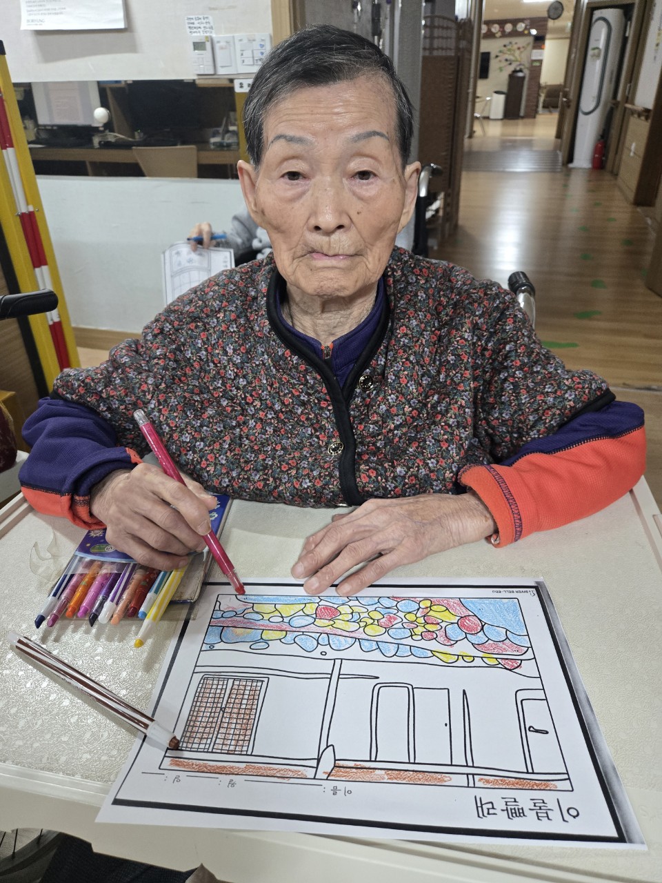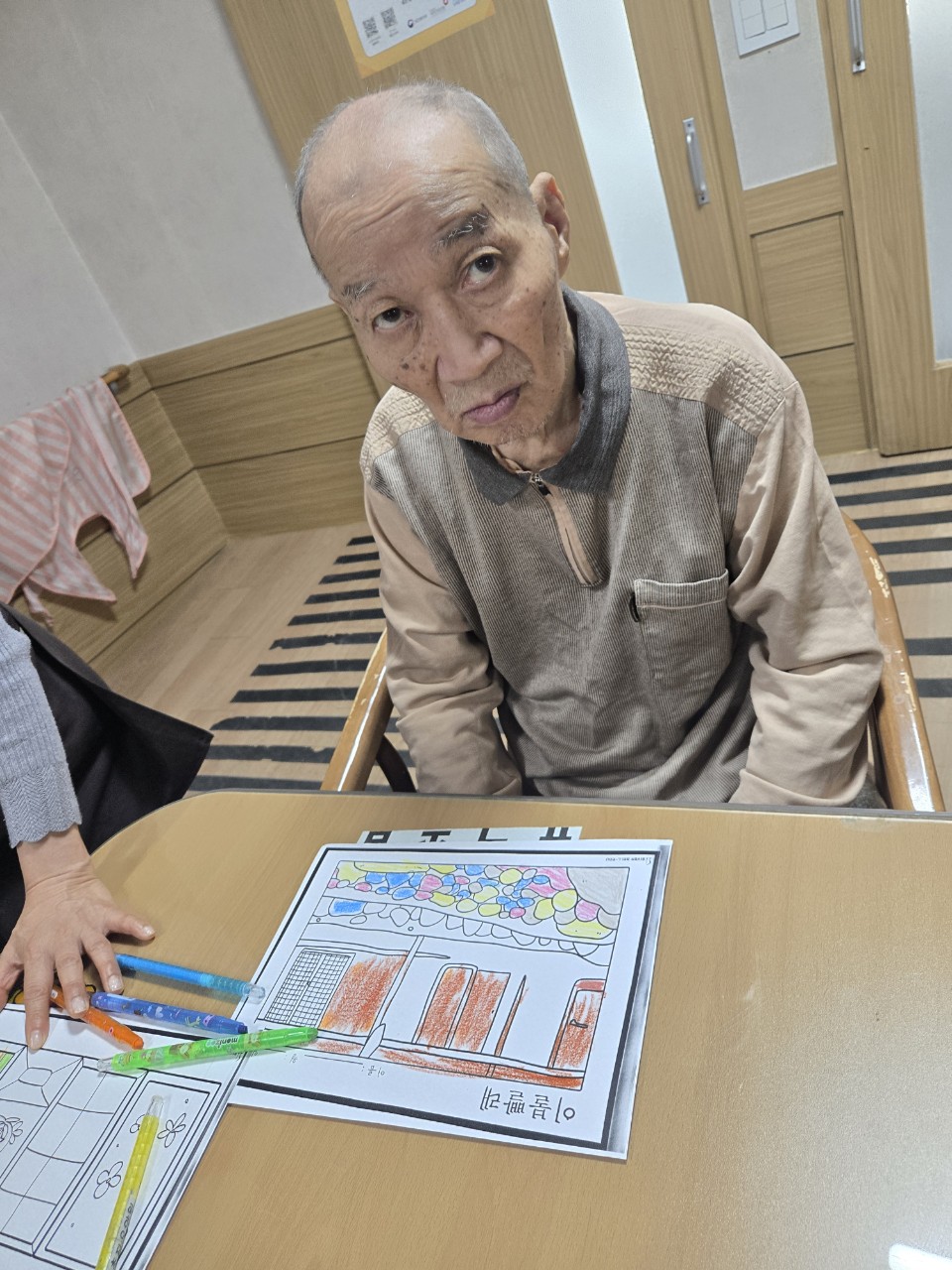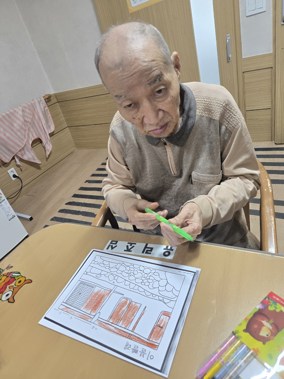 2. 준비된 그림도안과 색연필을 어르신께서 만져보게 한다.