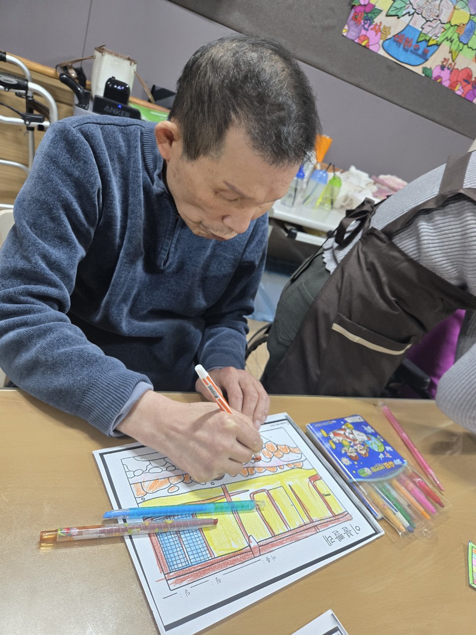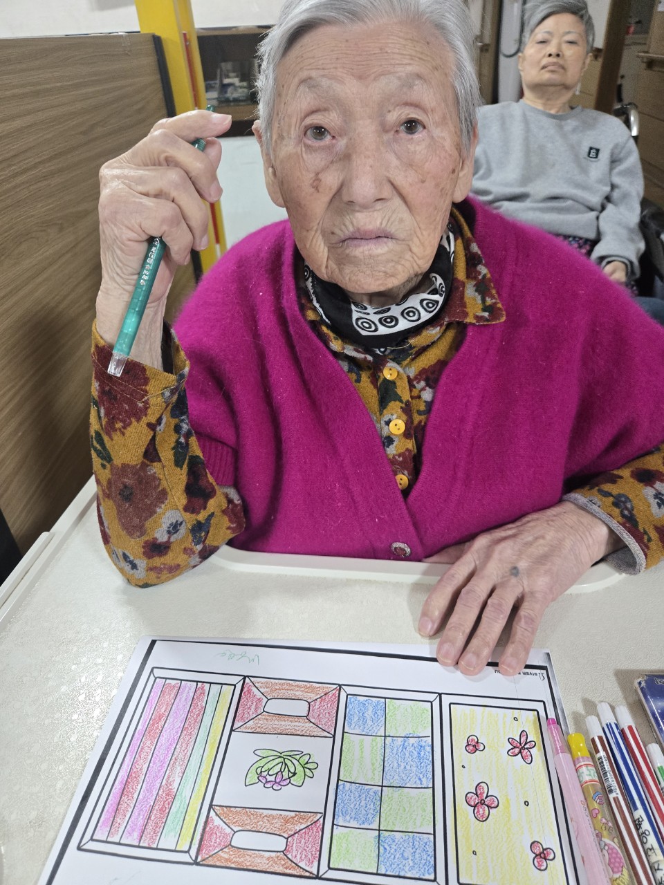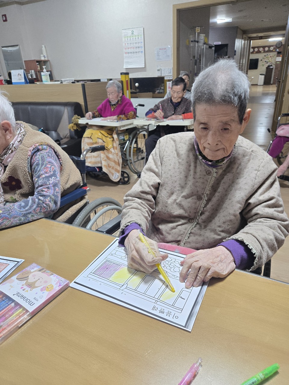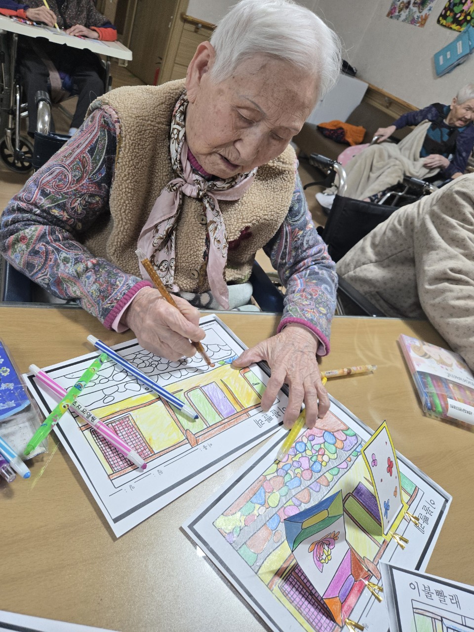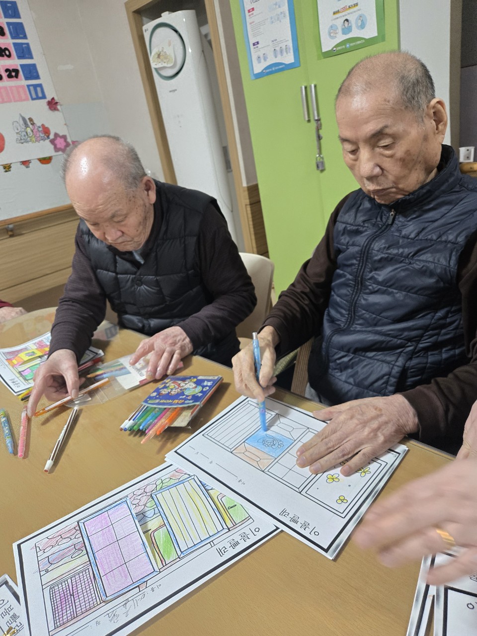 2. 준비된 그림도안과 색연필을 어르신께서 만져보게 한다.