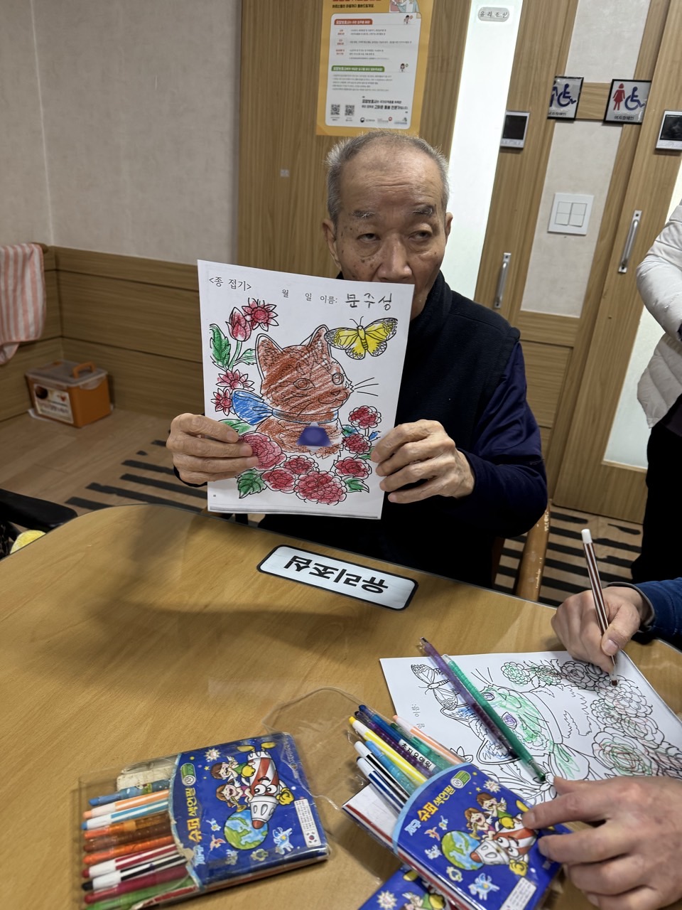 2. 준비된 그림도안과 색연필을 어르신께서 만져보게 한다.