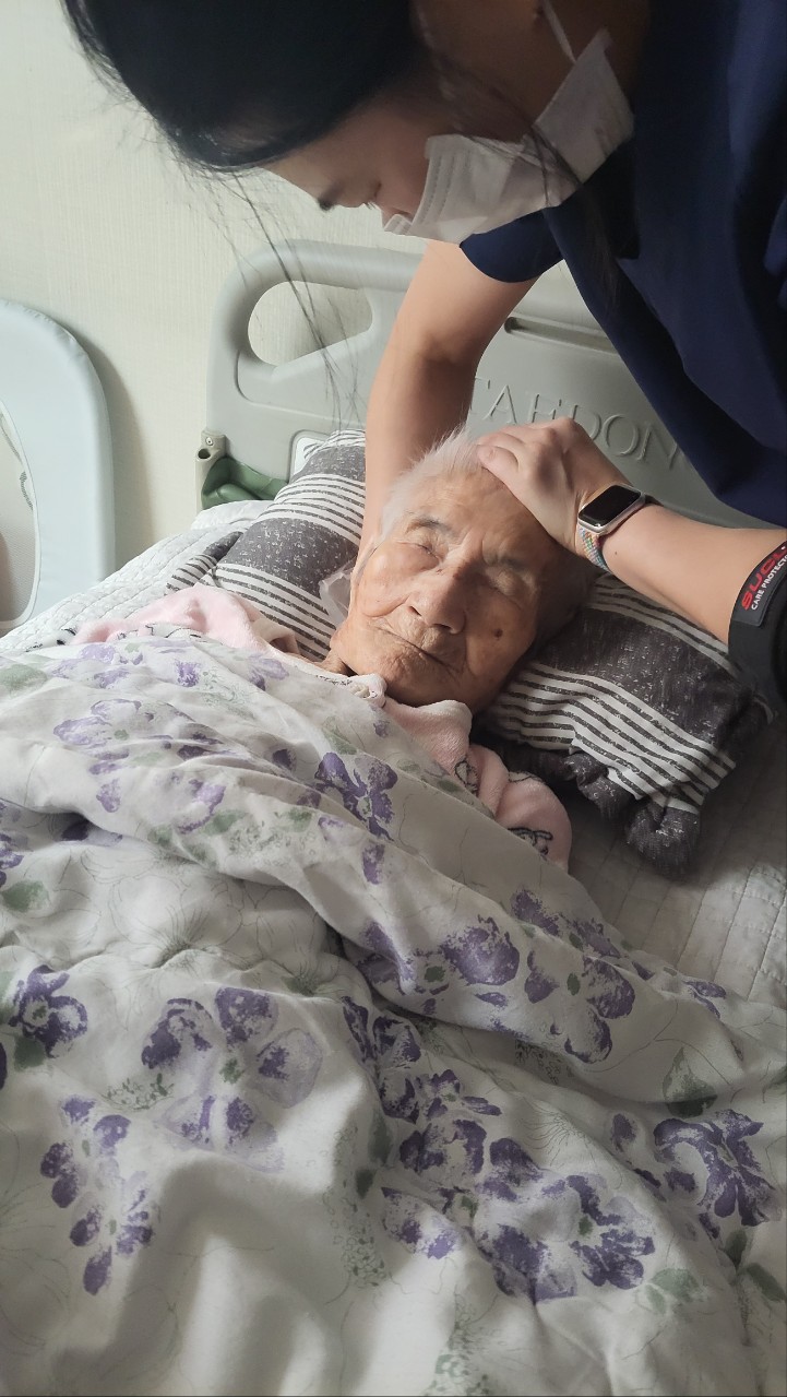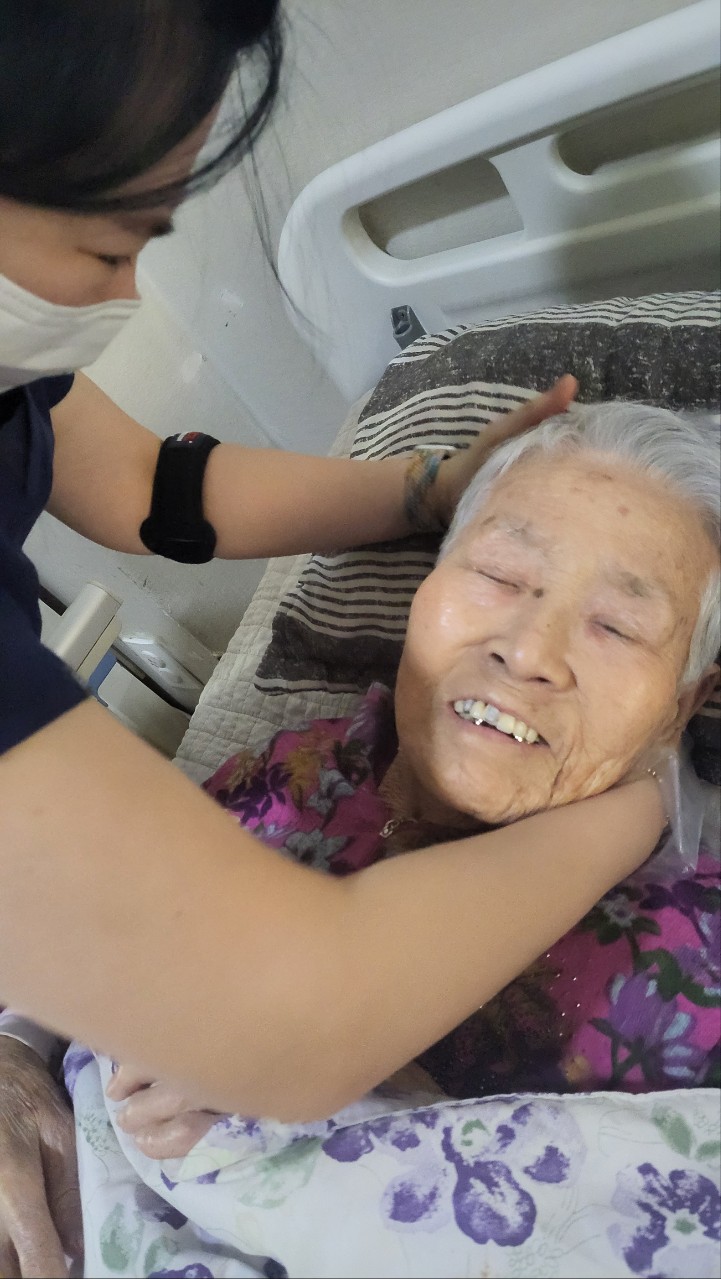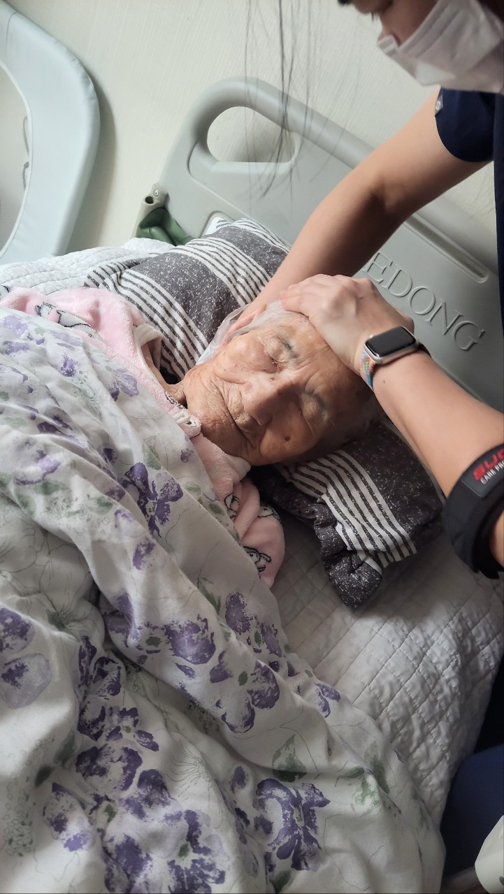 ② 진행 : 코에 오일 냄새를 맡게 하고, 관자놀이에 롤링기법으로 마사지를 해준다.