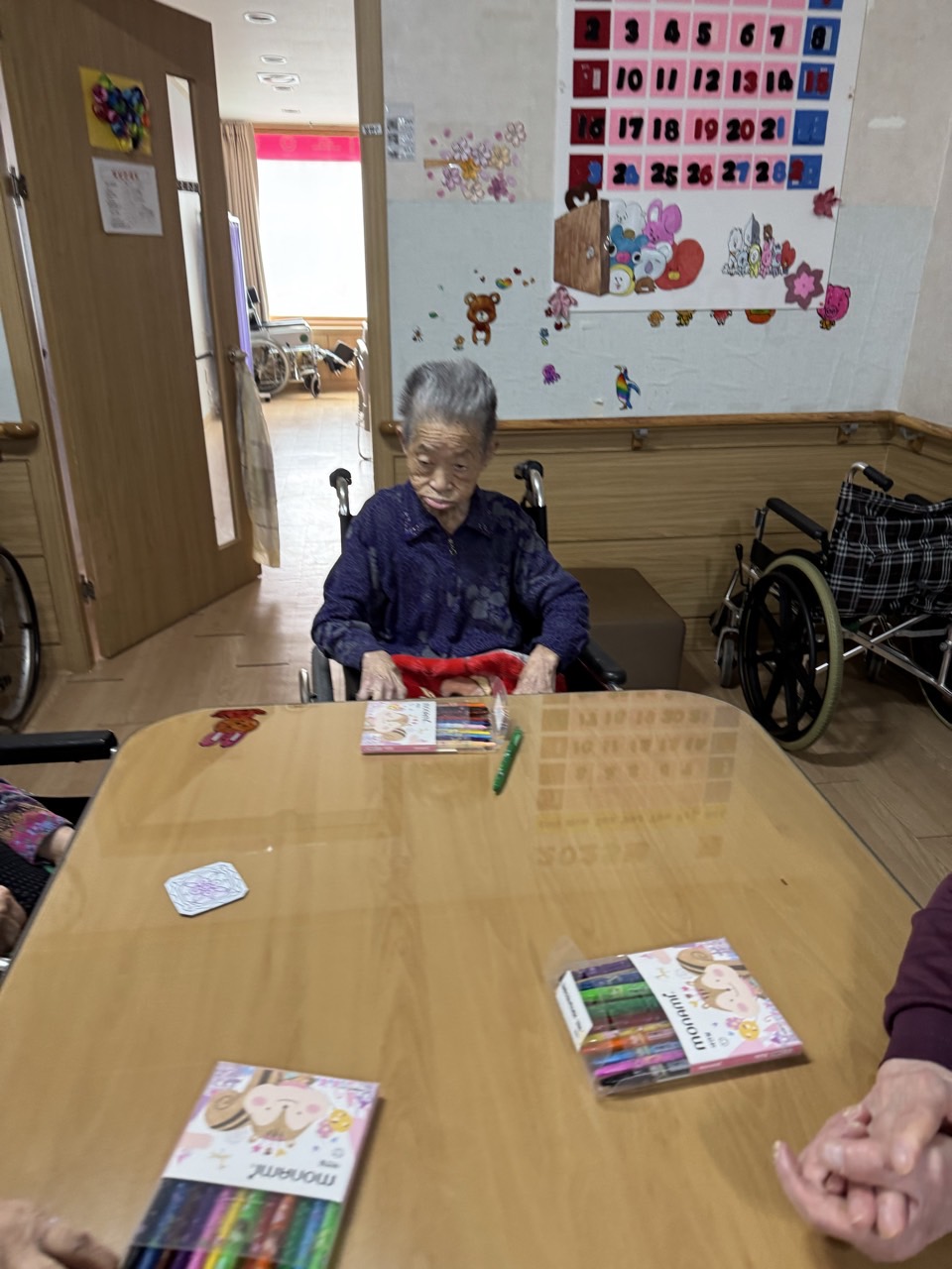 2. 준비된 그림도안과 색연필을 어르신께서 만져보게 한다.