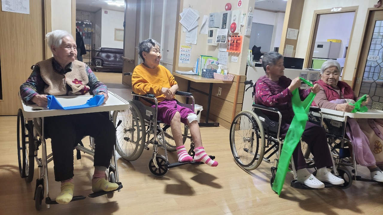 ② 어르신들에게 탄성밴드를 배분해 드린다.