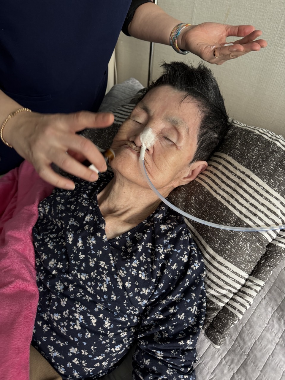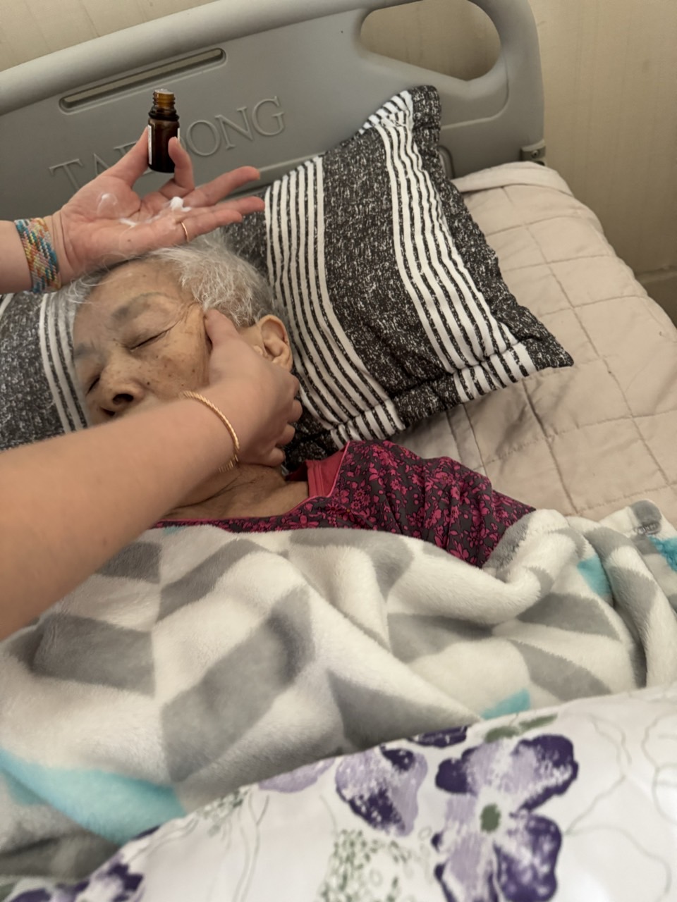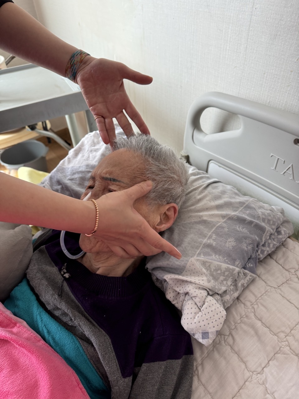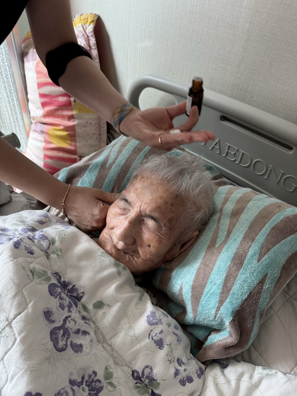 ② 진행 : 코에 오일 냄새를 맡게 하고, 관자놀이에 롤링기법으로 마사지를 해준다.