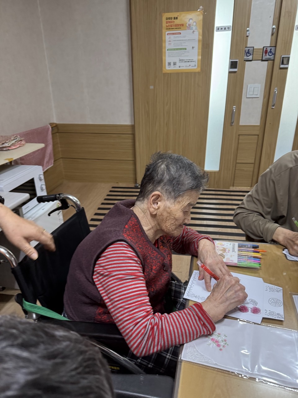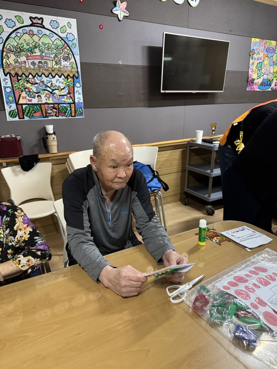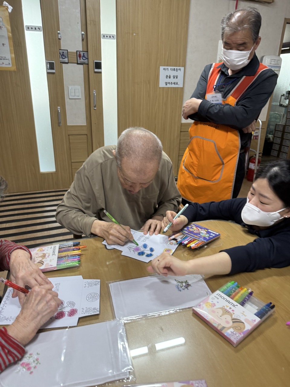 2. 준비된 그림도안과 색연필을 어르신께서 만져보게 한다.