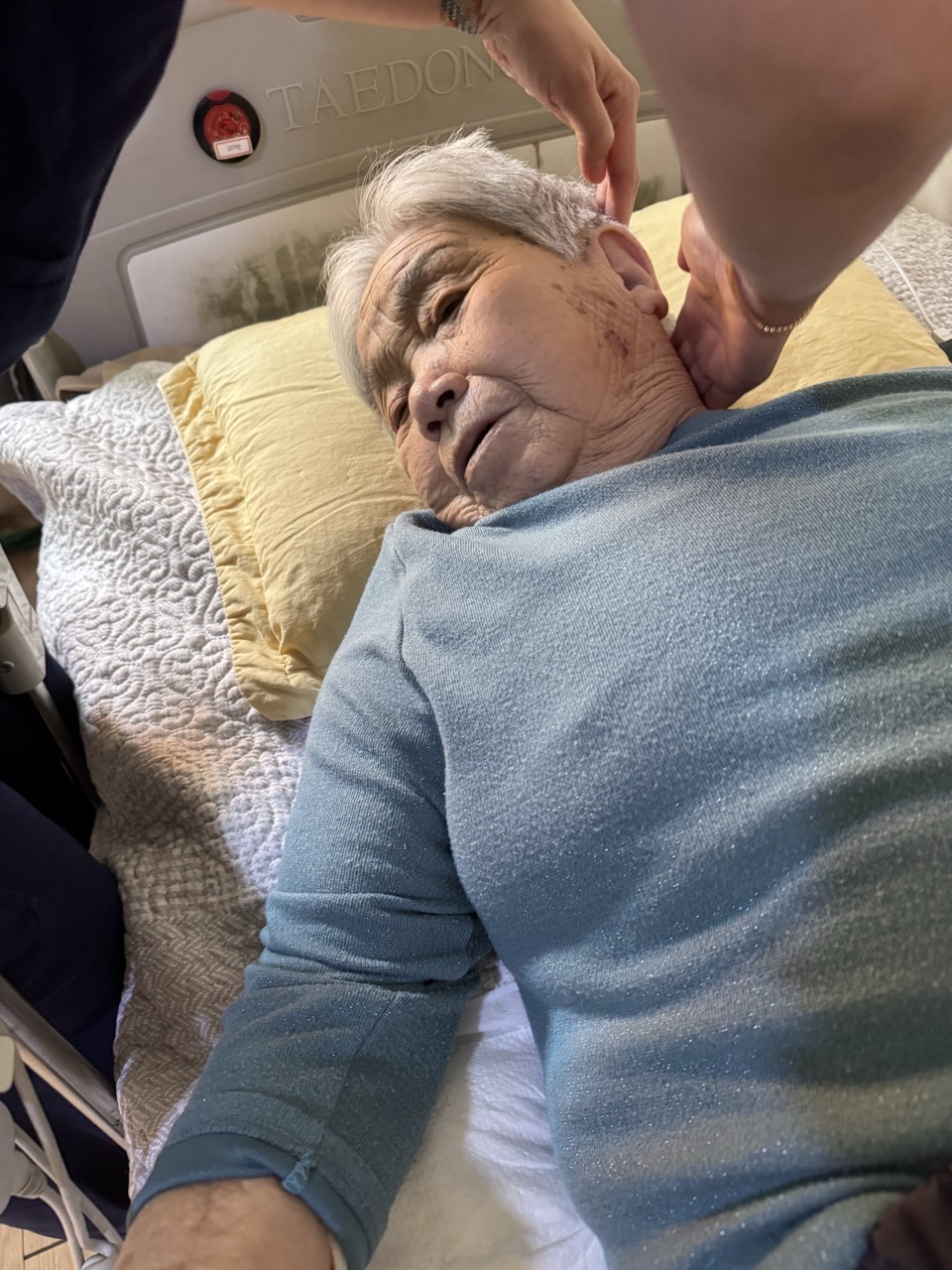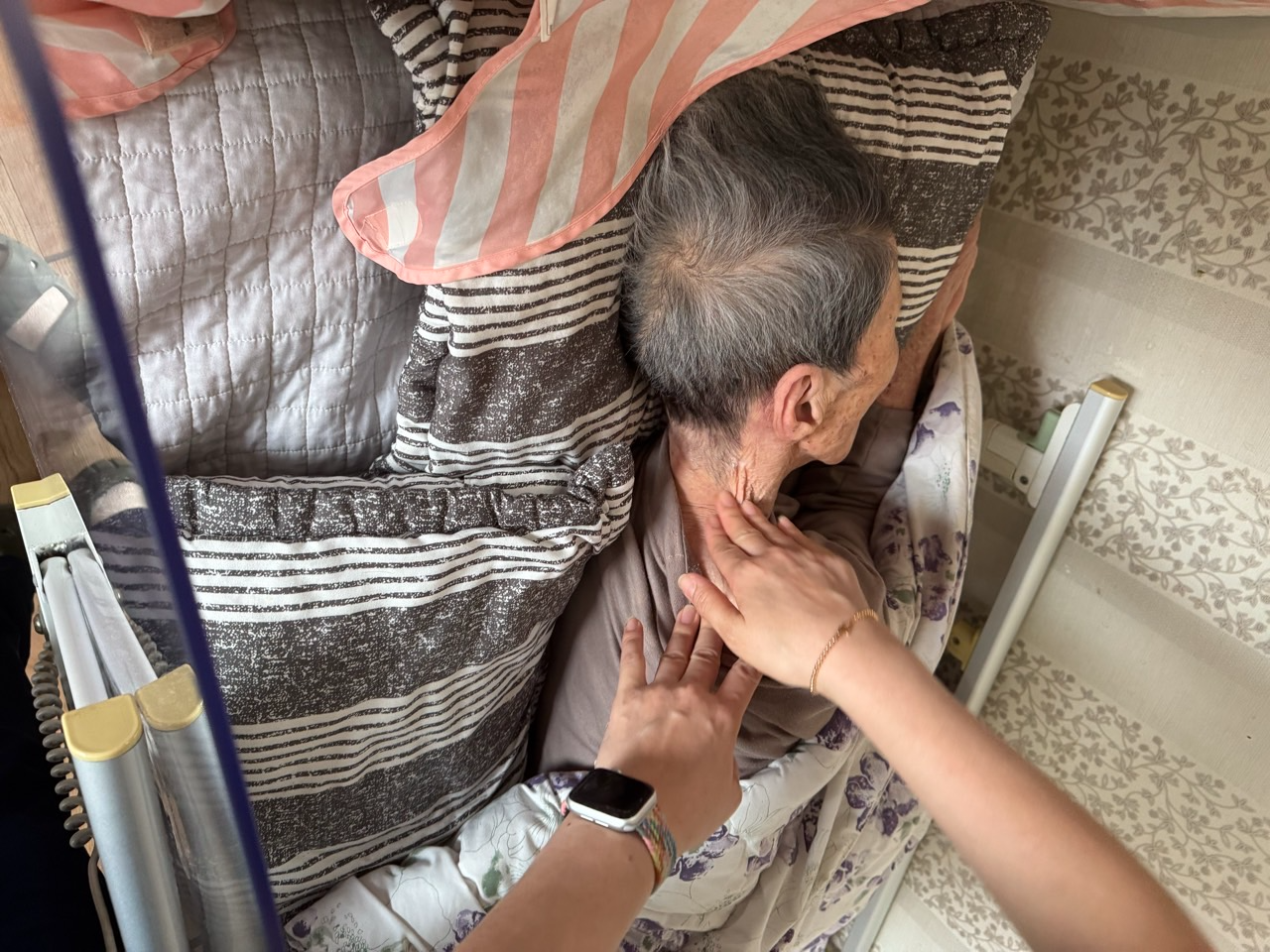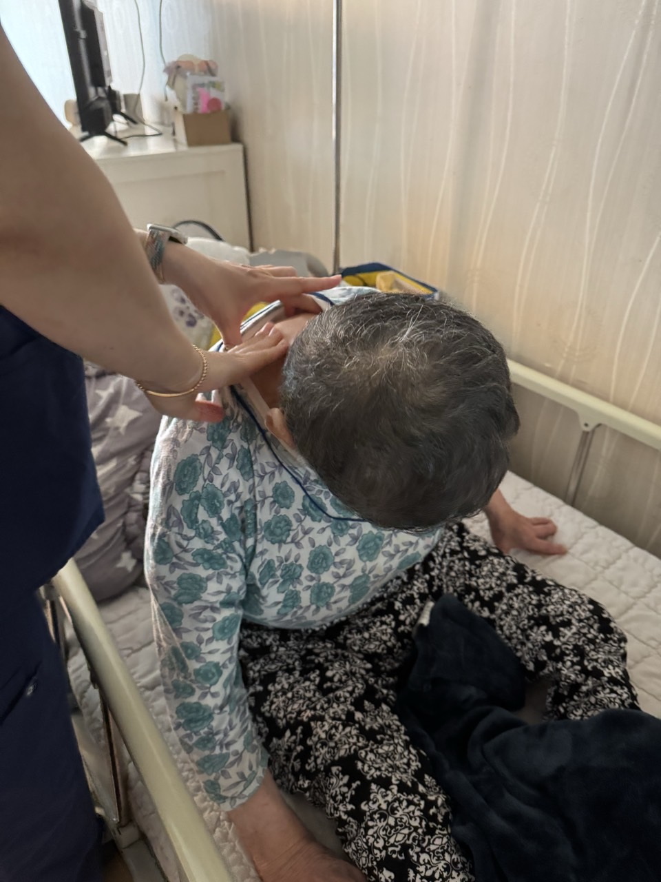 ② 진행 : 앉은자세에서 코에 오일냄새를 맡게 하고, 목 뒤쪽 후두하부를 롤링기법으로 마사지를 해준다