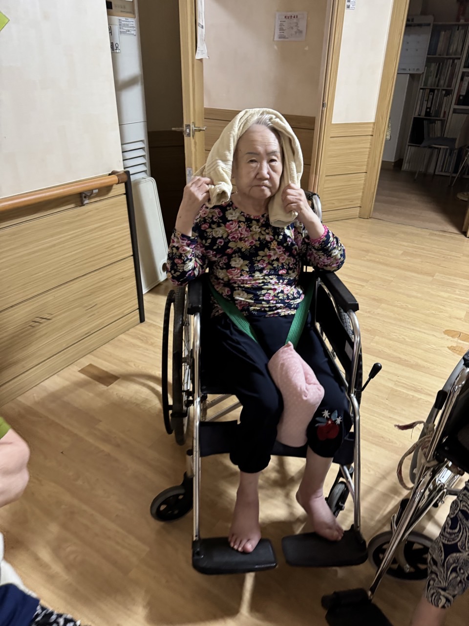 앉거나 누운 자세에서 부분 도움을 받아 타월을 이용하여 상체 운동을 해본다.