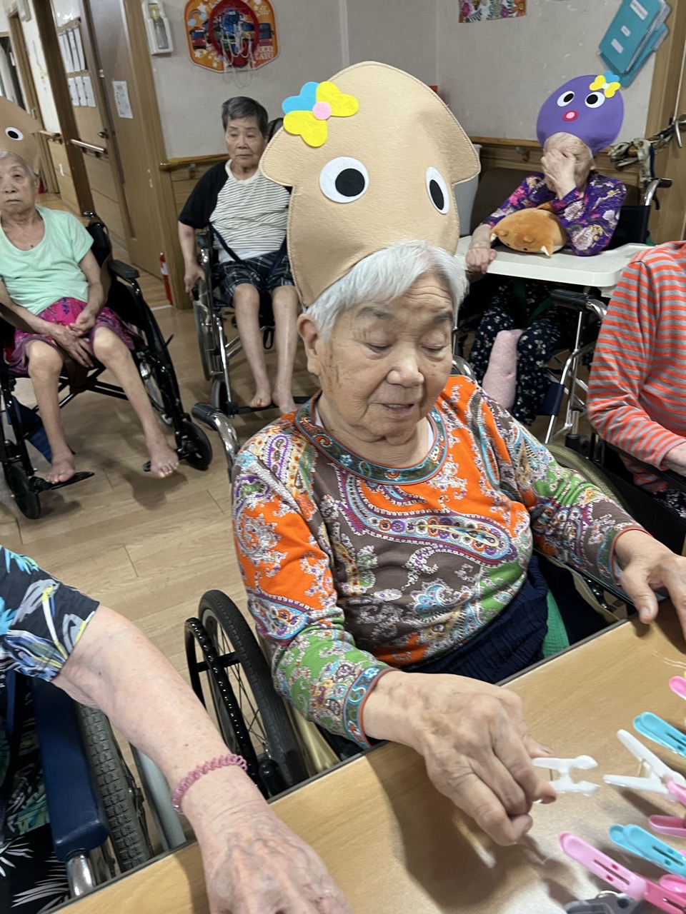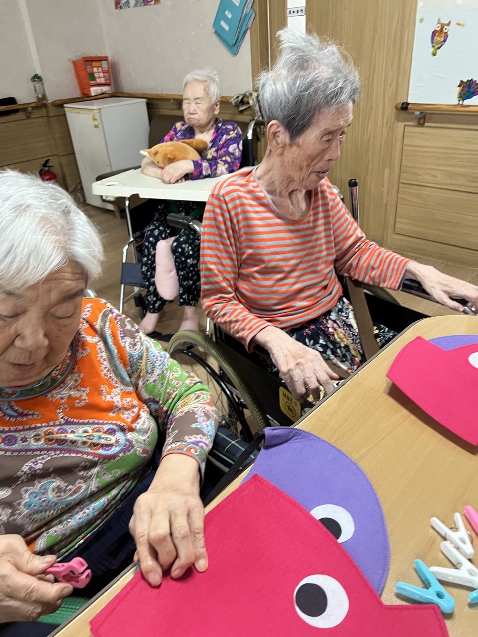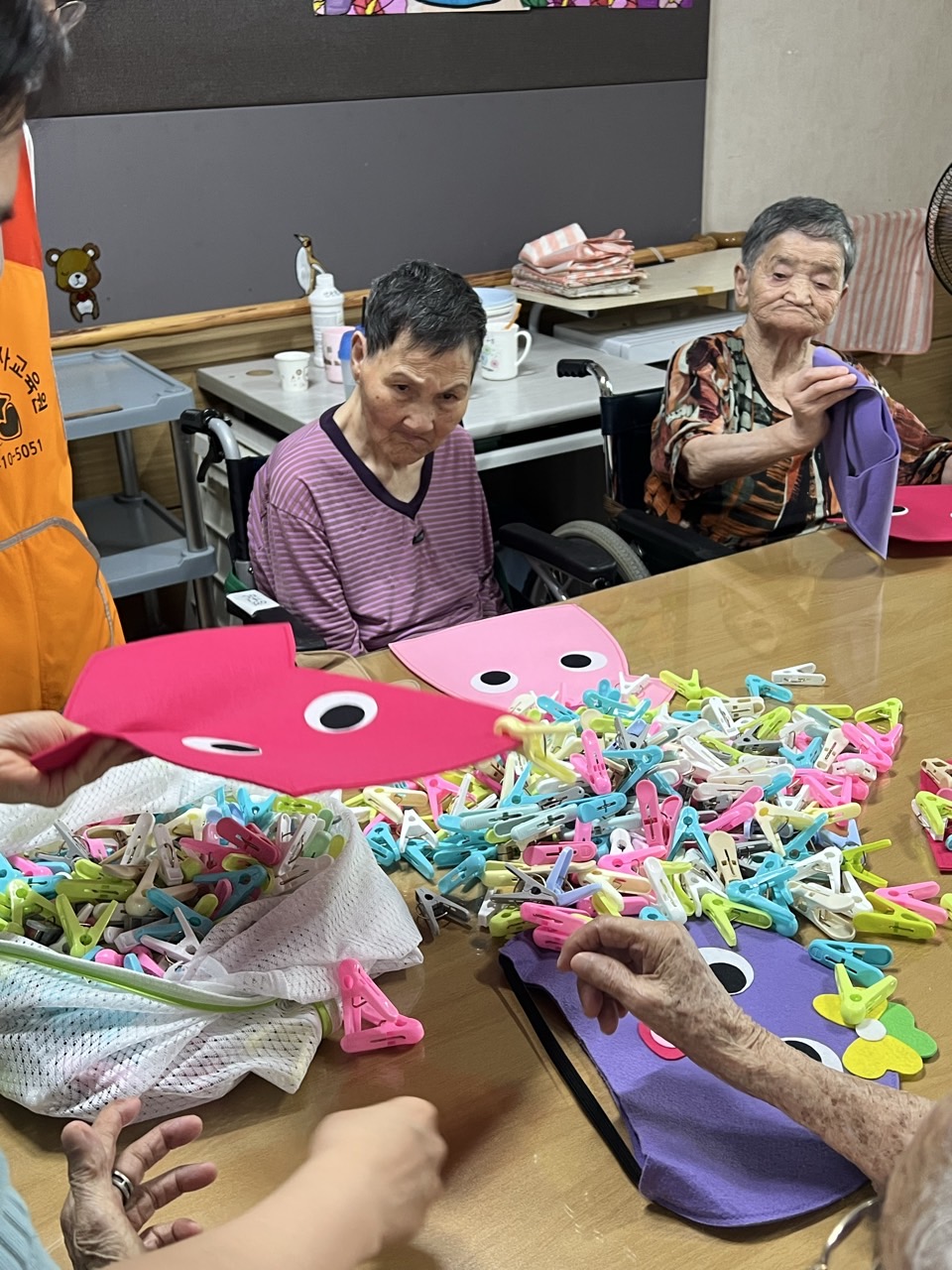 펠트 문어·오징어에게 빨래집게 다리 붙이기 인지활동을 할 수 있다.