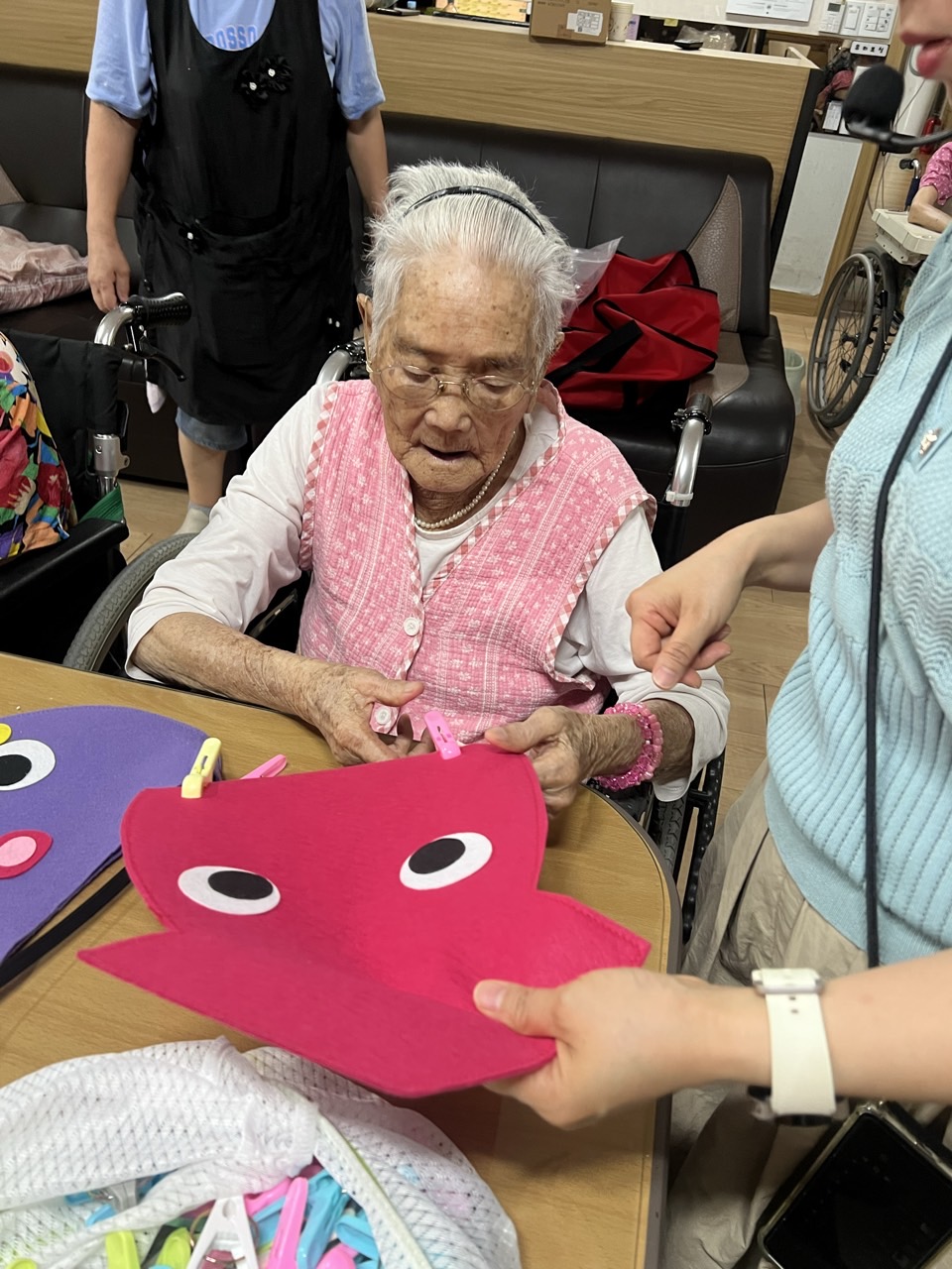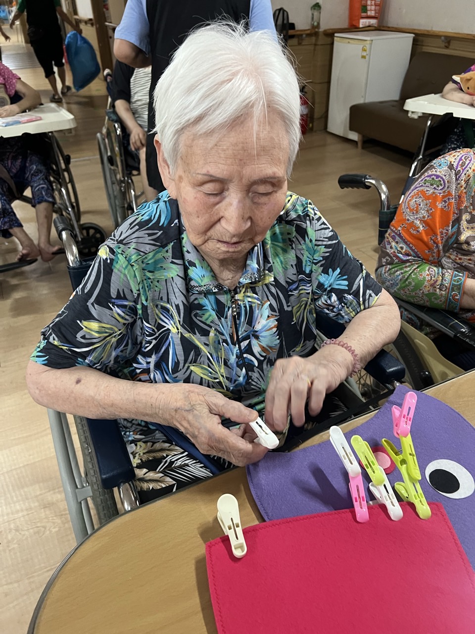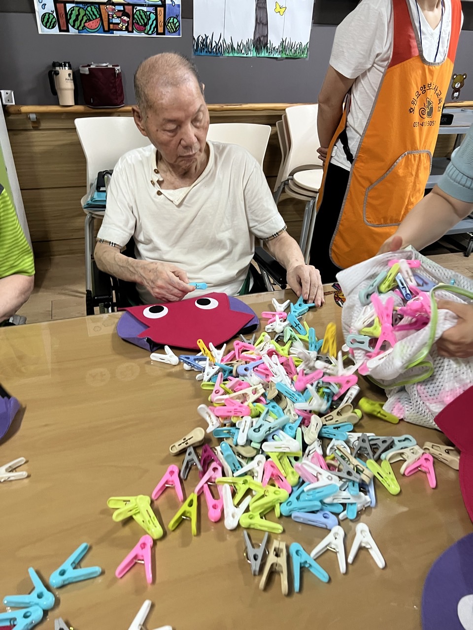 펠트 문어·오징어에게 빨래집게 다리 붙이기 인지활동을 할 수 있다.