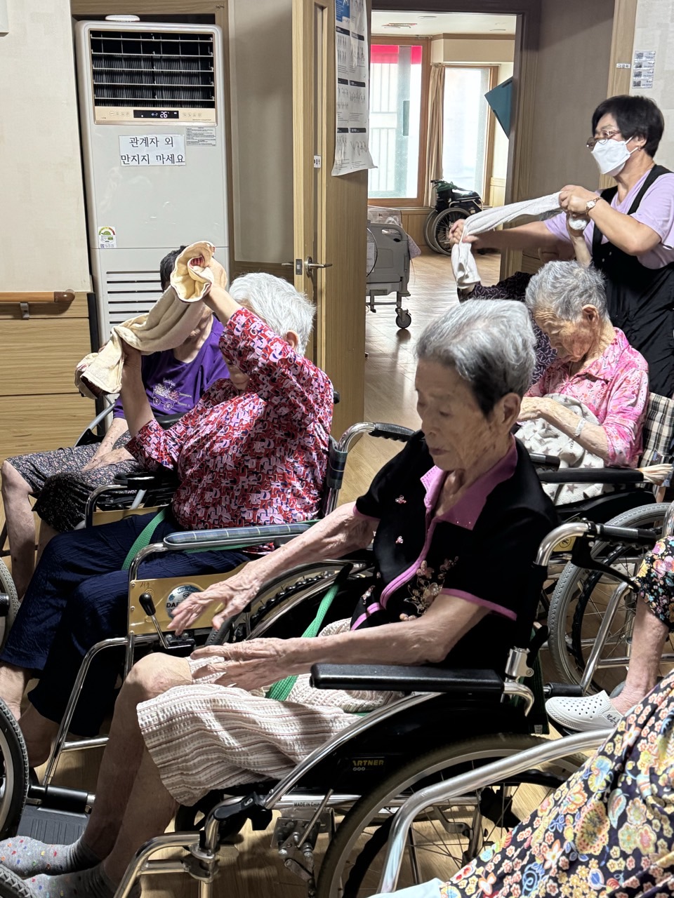② 타월을 하나씩 배분하여 어르신들이 받으실 수 있도록 한다.