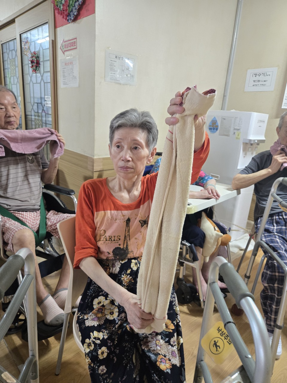 앉은 자세에서 타월을 이용하여 상체 운동해 본다.