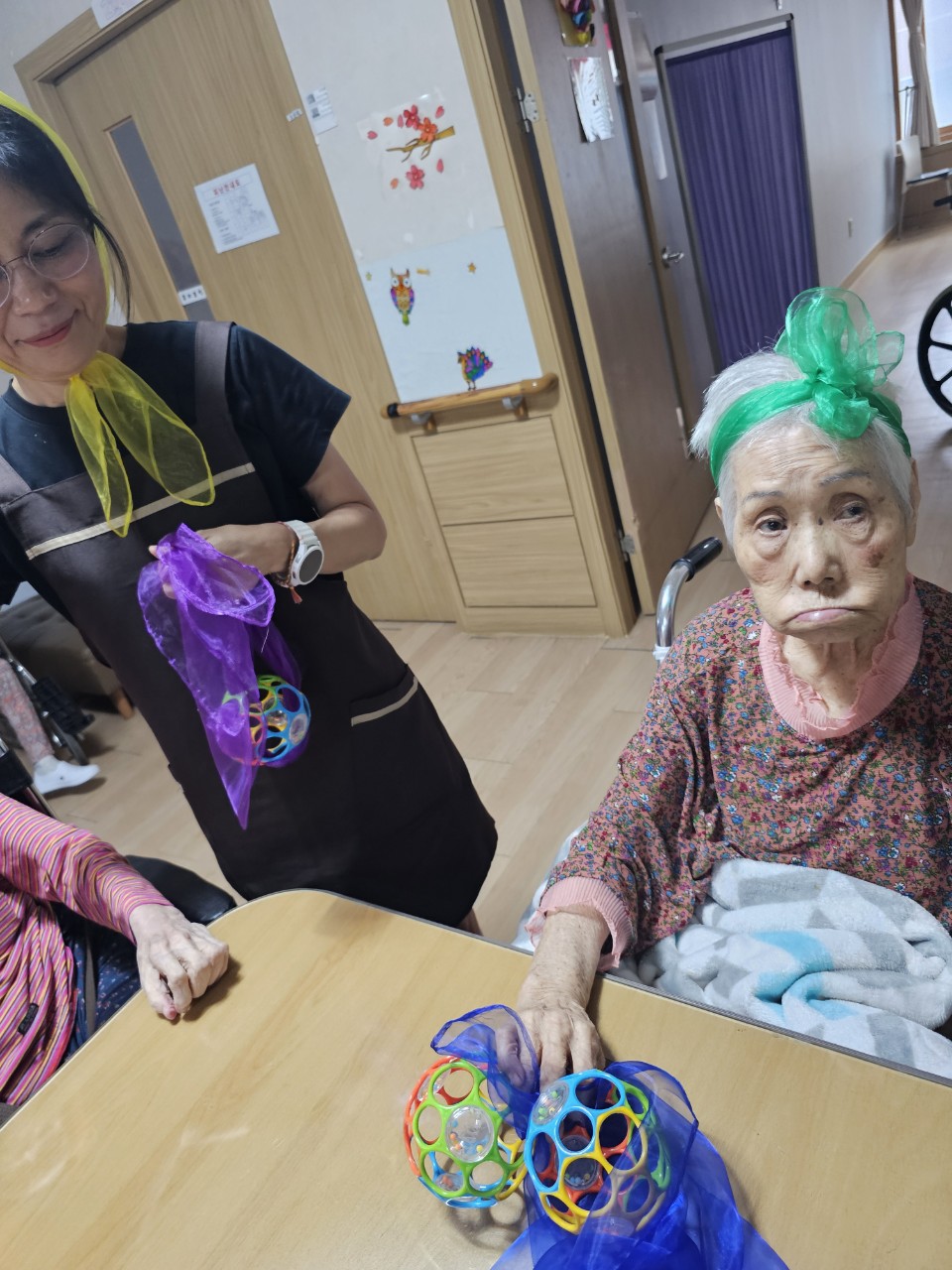 벨볼의 구멍에 스카프를 활용해 끼우고 돌리고 맞추는 시각·촉각·운동·인지 자극놀이를 할수 있다.