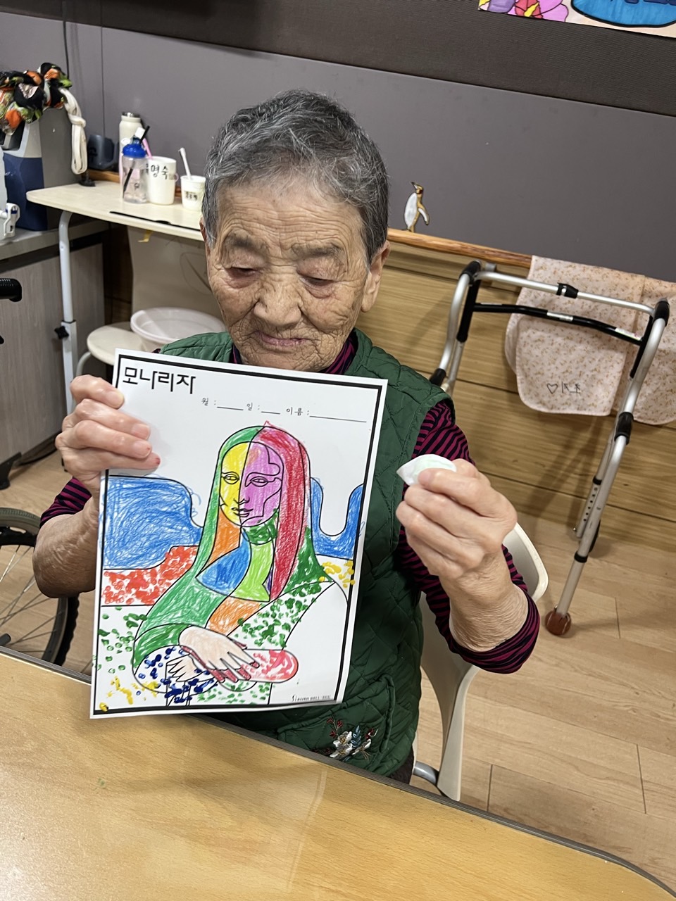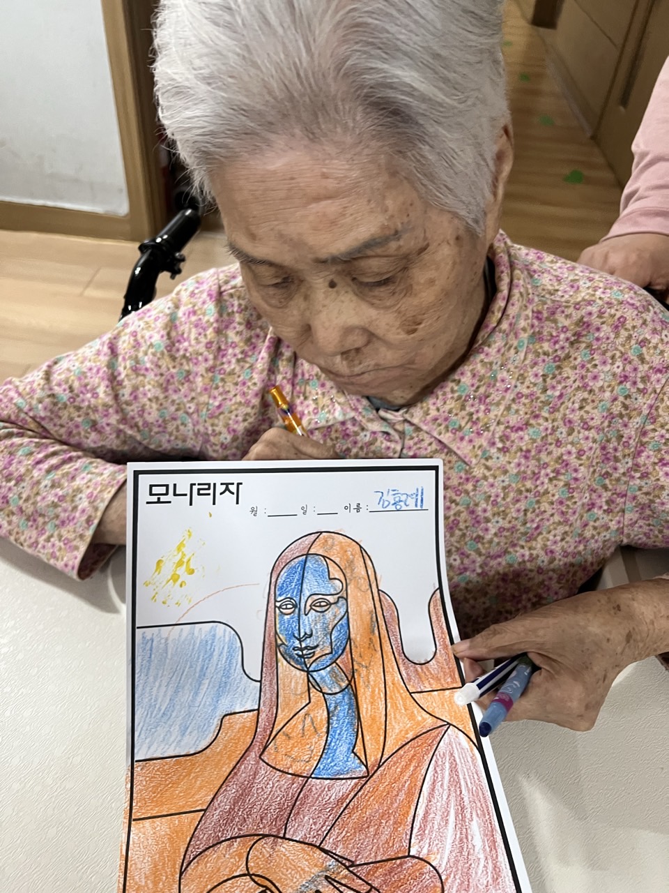 조각조각 나뉘어진 모나리자 그림을 색칠하고 점묘화로 표현하고 싶은 부분만 점묘화로표현해본다.