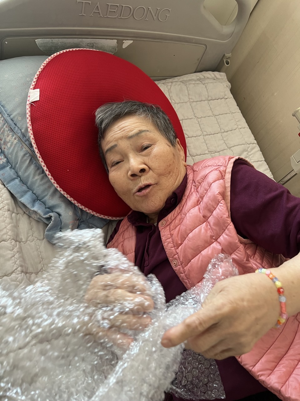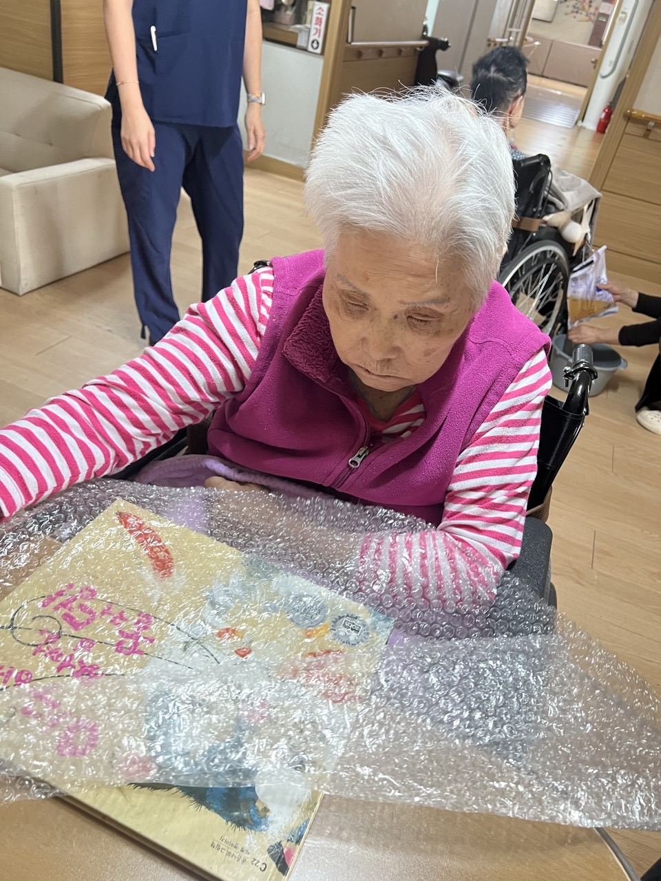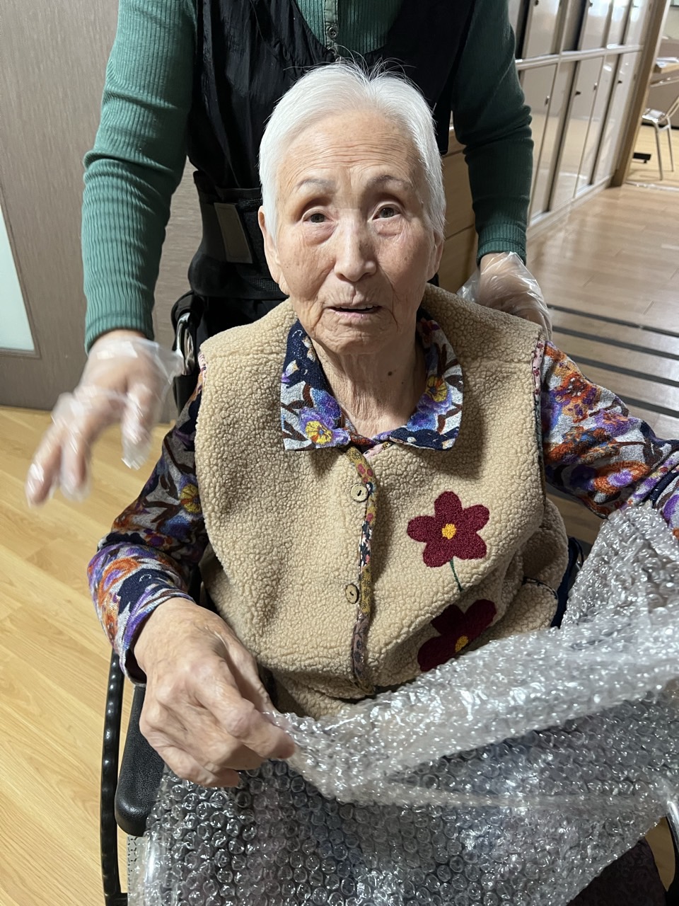 에어캡을 미리 준비하여 어르신들께 나눠 드리고 터트리는 것을 스스로 해보실 수 있도록 해본다.