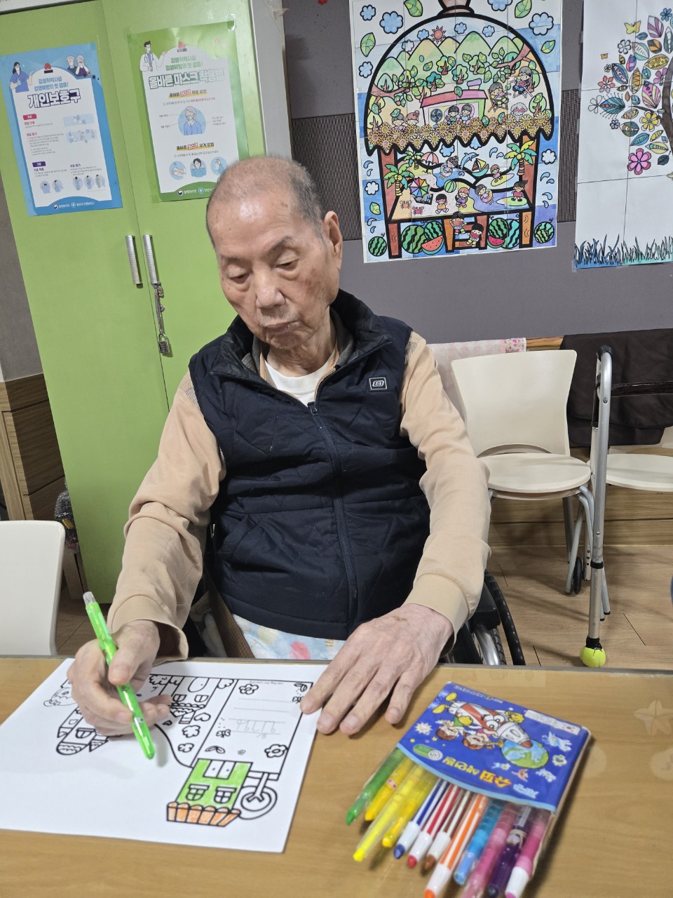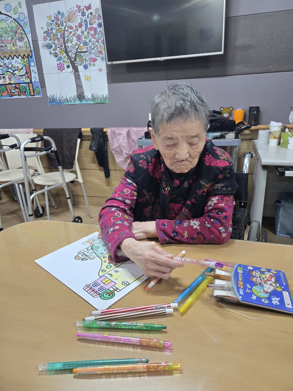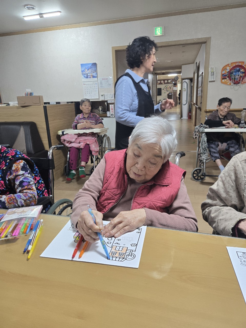 2. 준비된 그림도안과 색연필을 어르신께서 만져보게 한다.