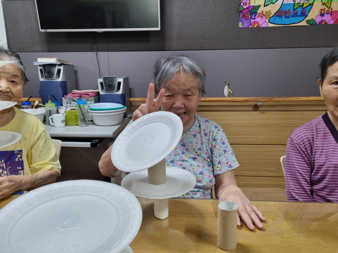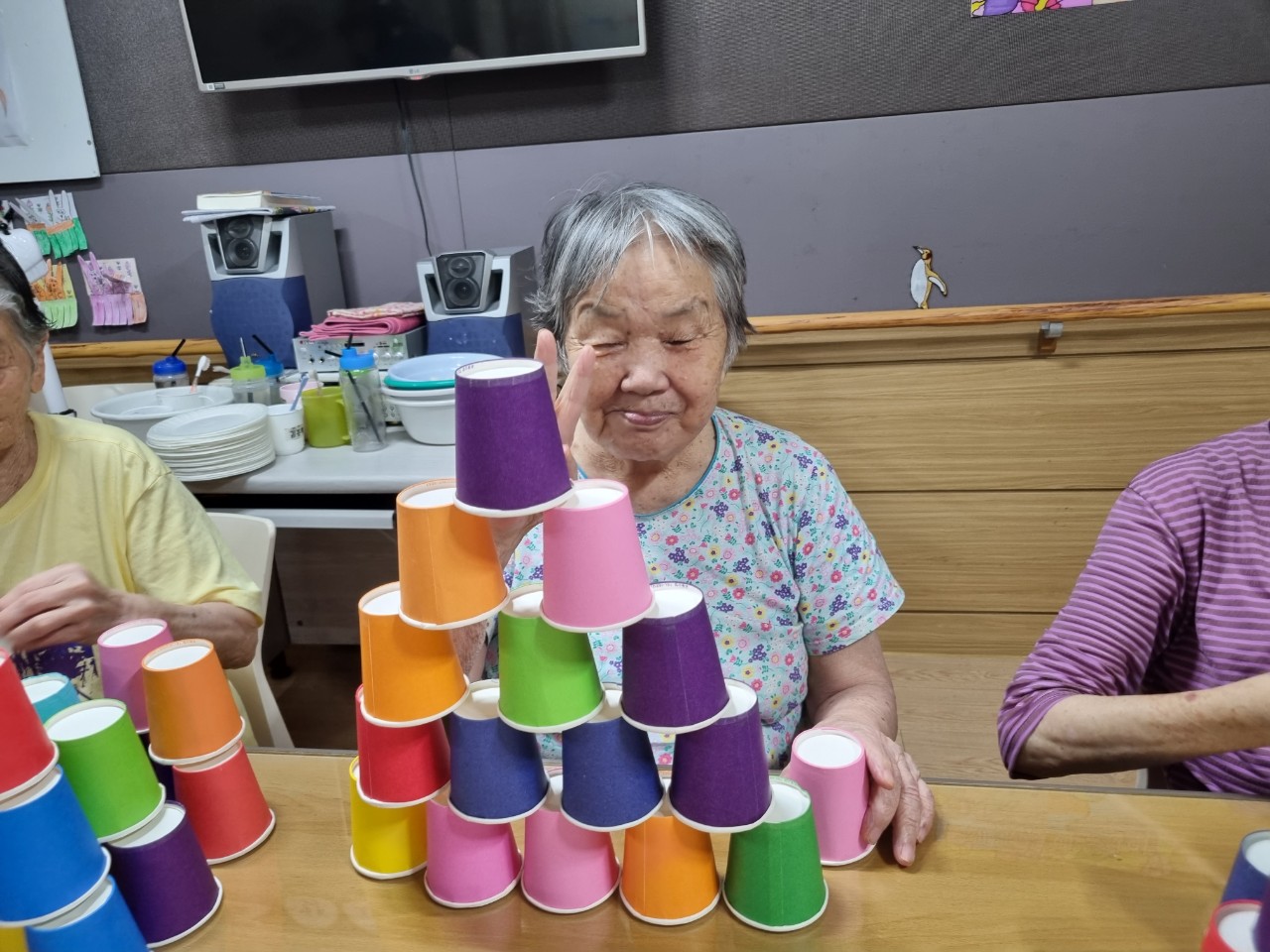 어르신들께서 휴지심 중심을 세우시면서 중심잡기를 잘 해보셨고 휴지심을 높이 쌓기, 종이컵 쌓기 등으로 집중력도 높이셨습니다.